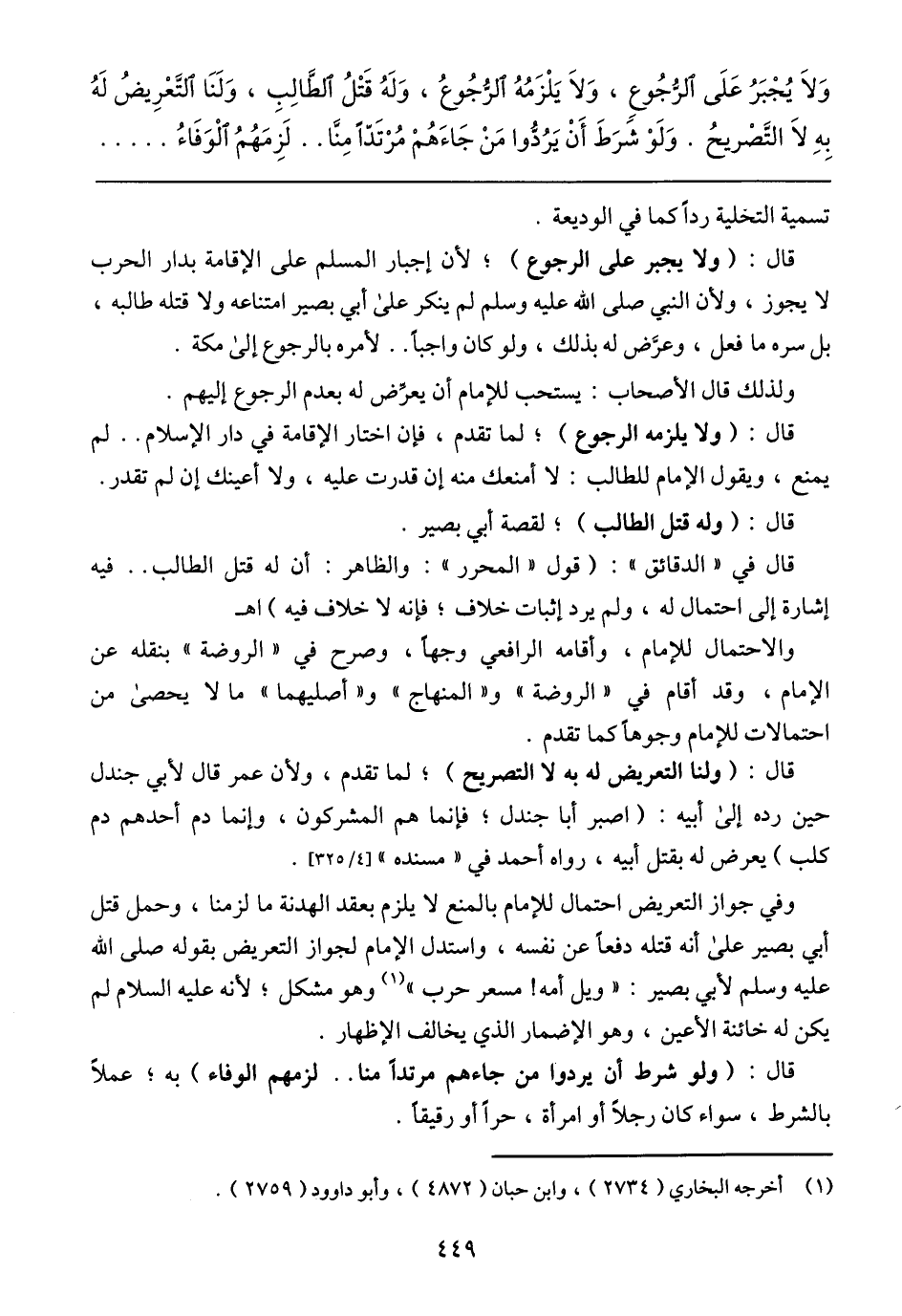 قال: (ولايجبر علي الرجوع)؛ لأن إجبار المسلم علي الإقامه بدار الحرب لا يجوز، ولأن النبي صلي الله عليه وسلم لم ينكر على أبي بصير امتناعه ولا قتله طالبه، بل سره ما فعل، وعرض له بذلك، ولو كان واجبًا .. لأمره بالرجوع إلى مكة.