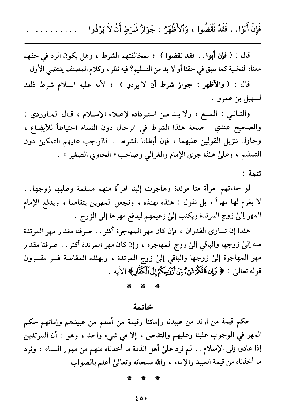 حكم قيمة من ارتد من عبيدنا وإمائنا وقيمة من أسلم من عبيدهم وإمائهم حكم المهر في الوجوب علينا وعليهم والتقاص، إلا في شئ واحد، وهو: أن المرتدين إذا عادوا إلي الإسلام ... لم نرد على أهل الذمة ما أخذناه منهم من مهور النساء، ونرد ما أخذناه من قيمة العبيد والإماء، والله سبحانه وتعالى أعلم بالصواب.
