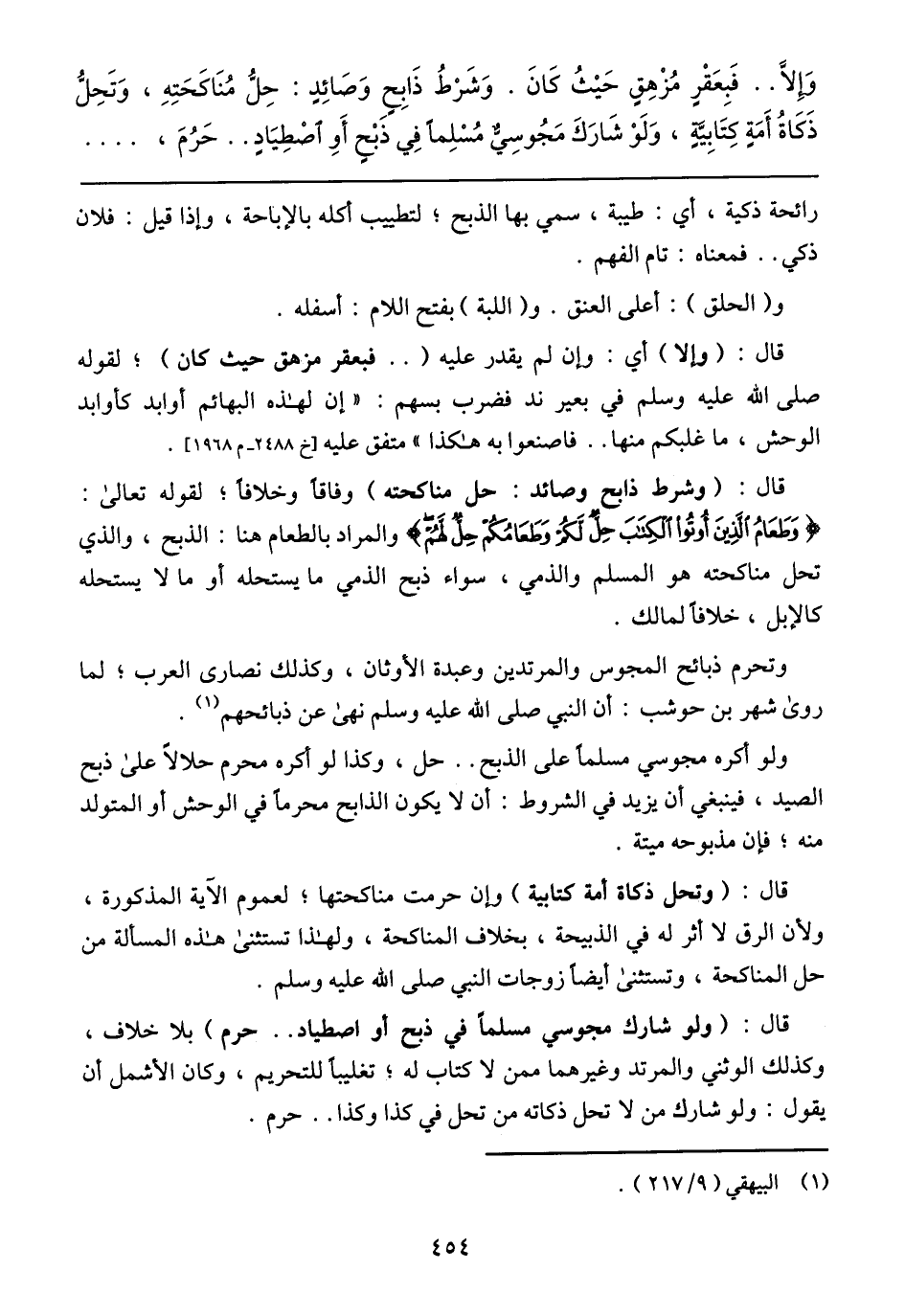قال: (وشرط ذابح وصائد: حل مناكحته) وفاقًا وخلافًا؛ لقوله تعالي: {وَطَعَامُ الَّذِينَ أُوتُوا الْكِتَابَ حِلٌّ لَكُمْ وَطَعَامُكُمْ حِلٌّ لَهُمْ} والمواد بالطعام هنا: الذبح، والذي تحل مناكحته هو المسلم والذمي، سواء ذبح الذمي ما يستحله أو ما لا يستحله كالإبل، خلافًا لمالك.