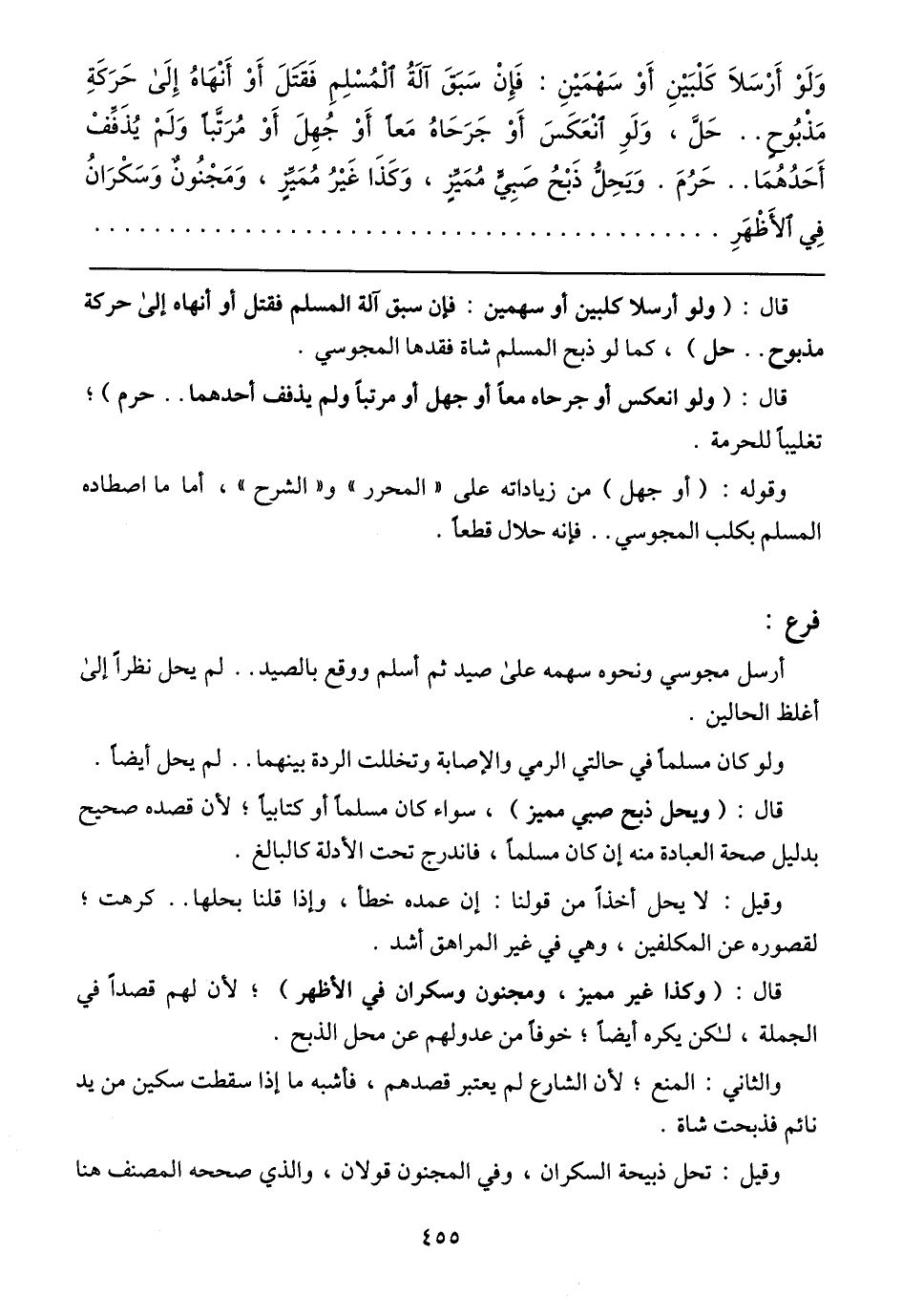 وَلَوْ أَرْسَلاَ كَلْبَيْنِ أوْ سَهْمَيْنِ: فَإِنْ سَبَقَ آلَةُ الْمُسْلِمِ فَقَتَلَ أَوْ أَنْهَاهُ إِلَى حَرَكَةِ مَذْبُوحٍ .. حّلَّ، وَلَوِ انْعَكَسَ أوْ جَرَحَاُ مَعًا أَوْ جُهِلَ أَوْ مُرَتَّبًا وَلَمْ يُذَفِّفْ أَحَدُهُمَا .. حَرْمَ. وَيَحِلُّ ذَبْحُ صَبِيِّ مُمَيِّزٍ، وَكَذَا غَيْرُ مُمَيِّزٍ، وَمَجْنُونٌ وَسَكْرَانُ فِي الأَظْهَرِ