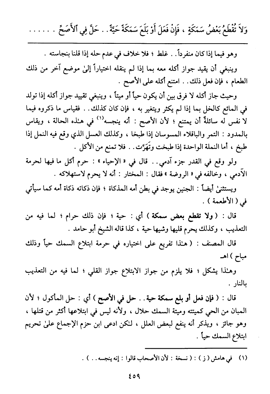 وَلاَ تُقْطَعُ بَعْضُ سَمَكَةٍ، فَإِنْ فَعَلَ أَوْ بَلَعَ سَمَكَةً حَيَّةً .. حَلَّ فِي الأَصَحِّ