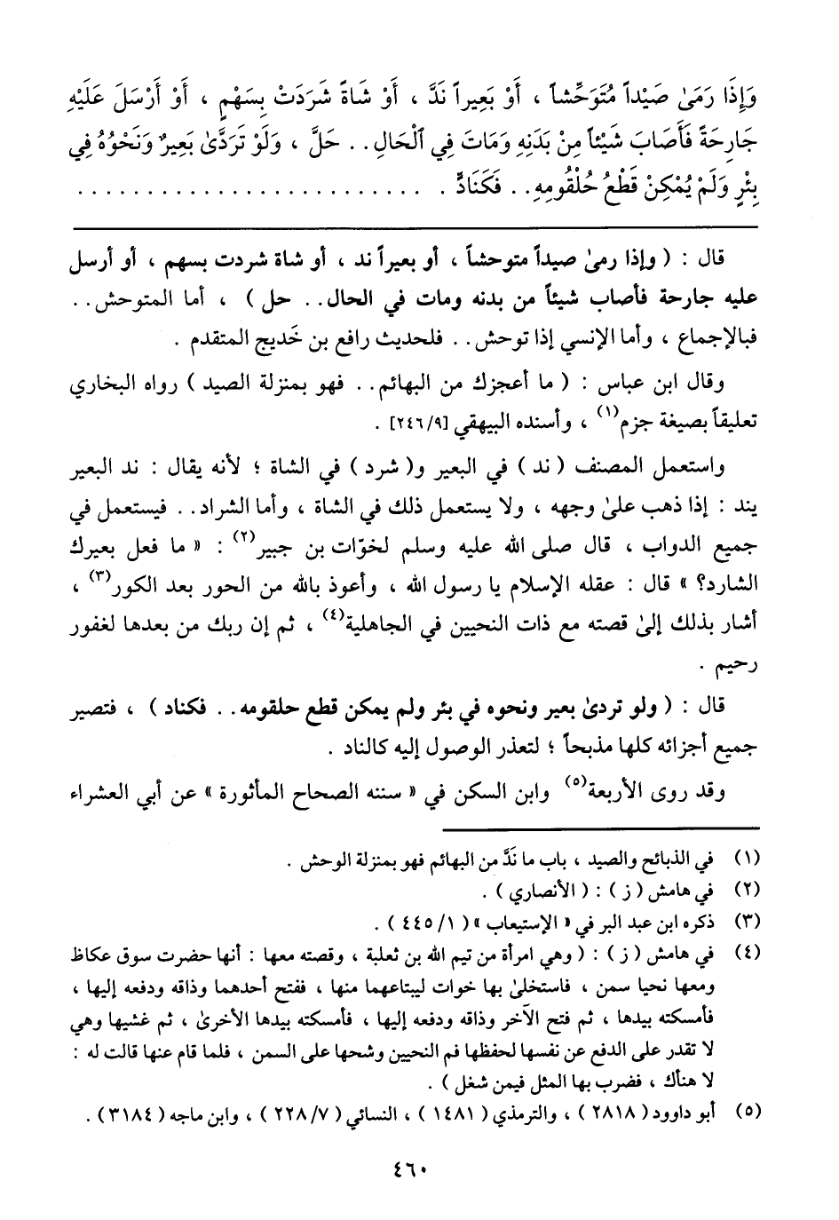 وَإِذَا رَمَى صَيْدًا مُتَوَحِّشًا، أَوْ بَعِيرًا نَدَّ، أَوْ شَاةً شَرَدَتْ بِسَهْمٍ، أَوْ أَرْسَلَ عَلَيْهِ جَارِحَةً فَأَصَابَ شَيْئًا مِنْ بَدَنِهِ وَمَاتَ فِي الْحَالِ .. حَلَّ، وَلَوْ تَرَدَّى بَعِيرٌ وَنَحْوُهُ فِي بِئْرٍ وَلَمْ يَمْكِنْ قَطْعُ حُلْقُومِهِ .. فَكَنَادٍّ