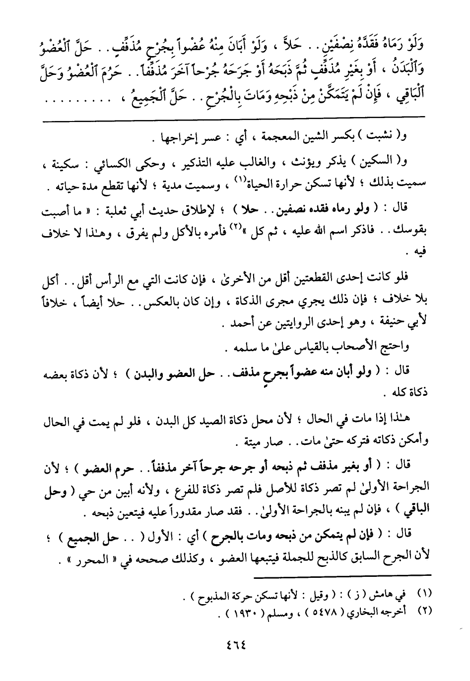 قال: (أو بغير مذفف ثم ذبحه أو جرحه جرحًا آخر مذففًا .. حرم العضو)؛ لأن الجراحة الأولى لم تصر ذكاة للأصل فلم تصر ذكاة للفرع، ولأنه أبين من حي (وحل الباقي)، فإن لم يبنه بالجراحة الأولى .. فقد صار مقدورًا عليه فيتعين ذبحه.