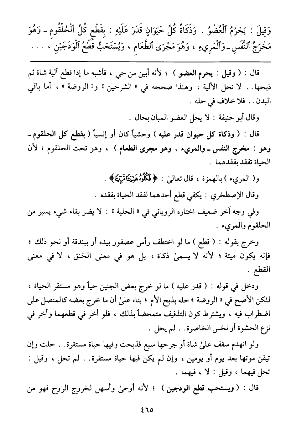 وَقِيلَ: يَحْرُمُ الْعُضْوُ. وَذَكَاةُ كُلِّ حَيَوَانٍ قَدَرَ عَلَيْهِ: بِقَطْعِ كُلِّ الْحُلْقُومِ – وَهُوَ مَخْرَجُ النَّفَسِ – وَالْمَرِيءِ، وَهُوَ مَجْرَى الطَّعَامِ، وَيُسْتَحَبُّ قَطْعُ الْوَدَجَيْنِ،