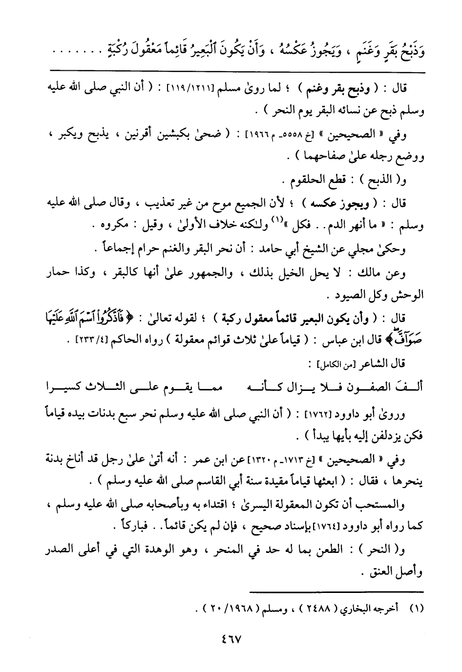 قال: (وأن يكون البعير قائمًا معقول ركبة)؛ لقوله تعالى: {فَاذْكُرُوا اسْمَ اللهِ عَلَيْهَا صَوَآفَّ} قال ابن عباس: (قيامًا على ثلاث قوائم معقولة) رواه الحاكم [4/ 233].