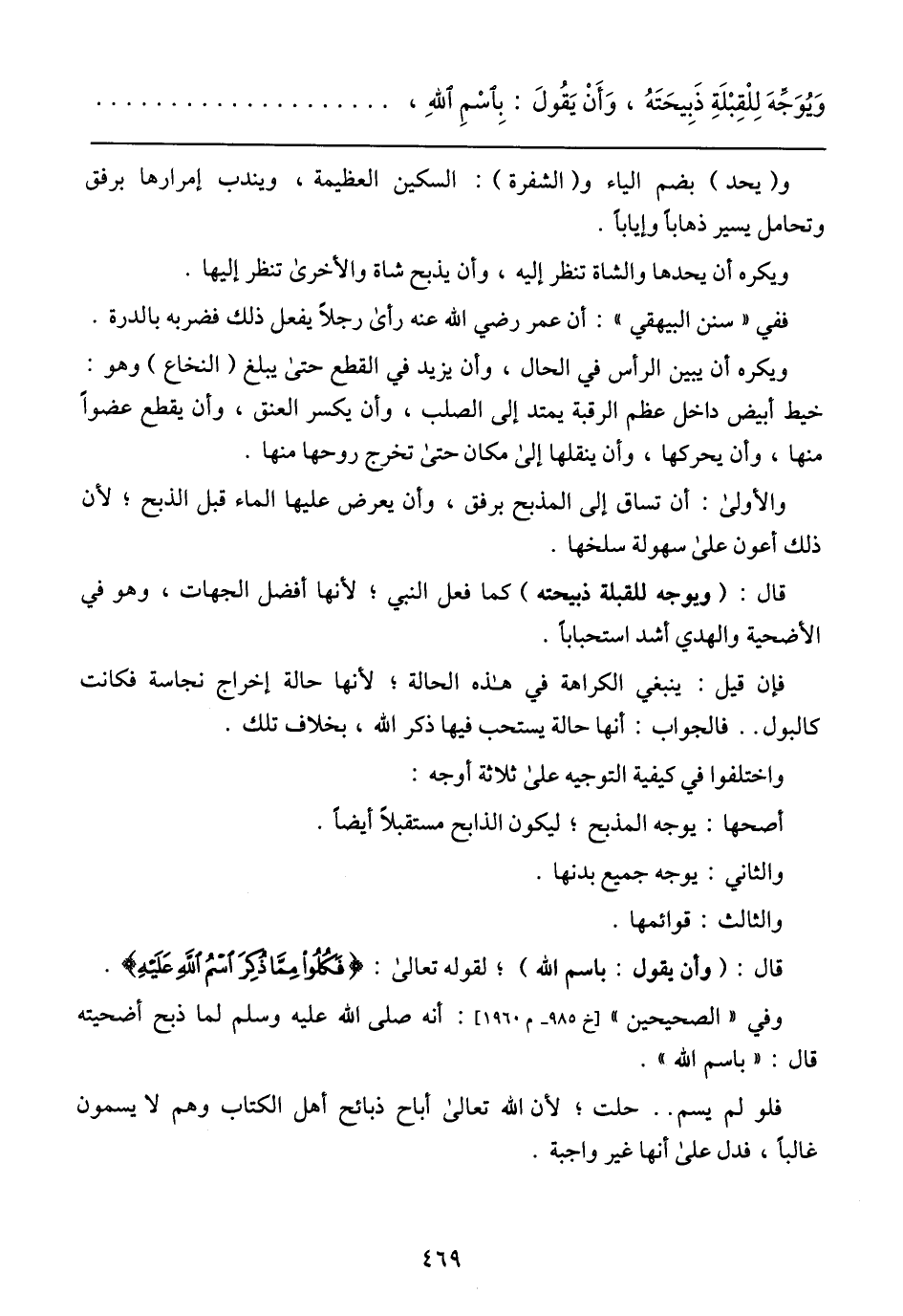 ويكره أن يبين الرأس في الحال، وأن يزيد في القطع حتى يبلغ (النخاع) هو: خيط أبيض داخل عظم الرقبة يمتد إلى الصلب، وأن يكسر العنق، وأن يقطع عضوًا منها، وأن يحركها، وأن ينقلها إلى مكان حتى تخرج روحها منها.