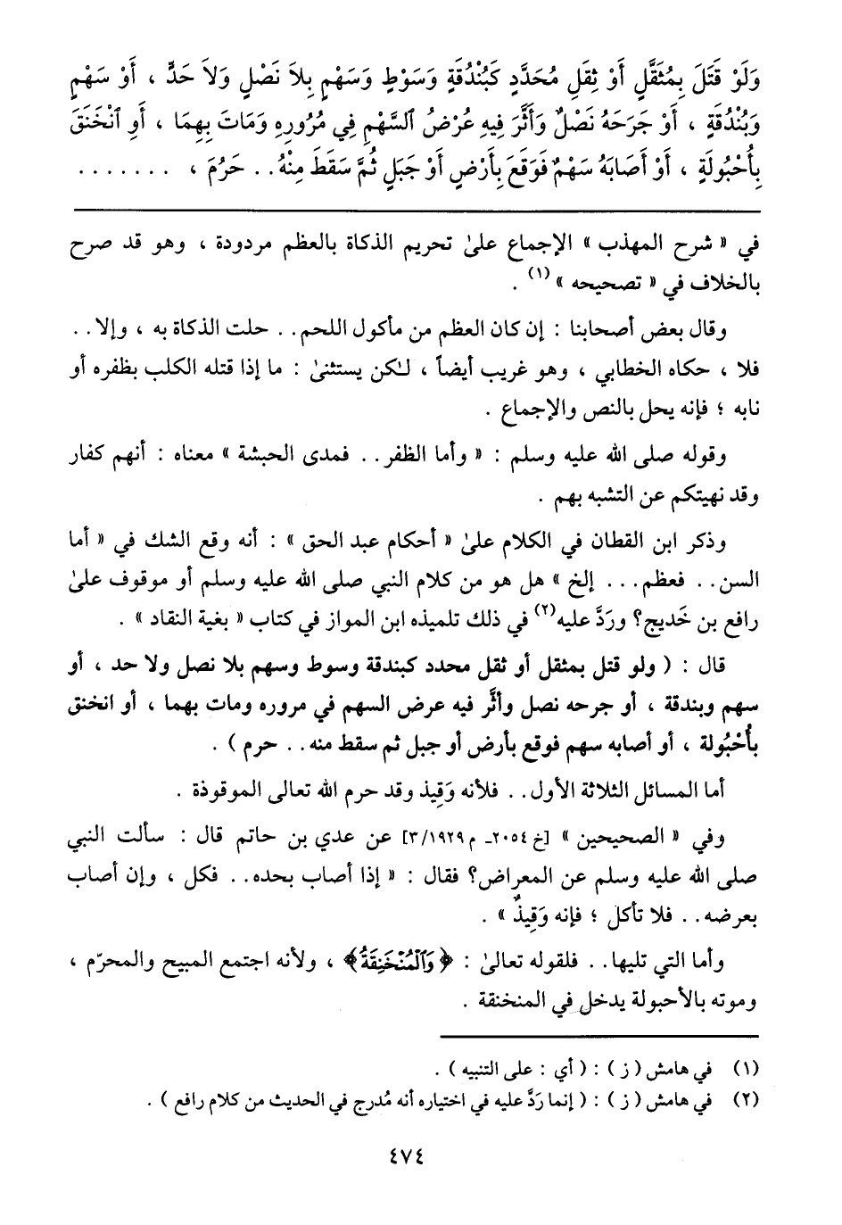 وقال بعض أصحابنا: إن كان العظم من مأكول اللحم .. حلت الذكاة به، وإلا .. فلا، حكاه الخطابي، وهو غريب أيضًا، لكن يستثنى: ما إذا قتله الكلب بظفره أو نابه؛ فإنه يحل بالنص والإجماع.