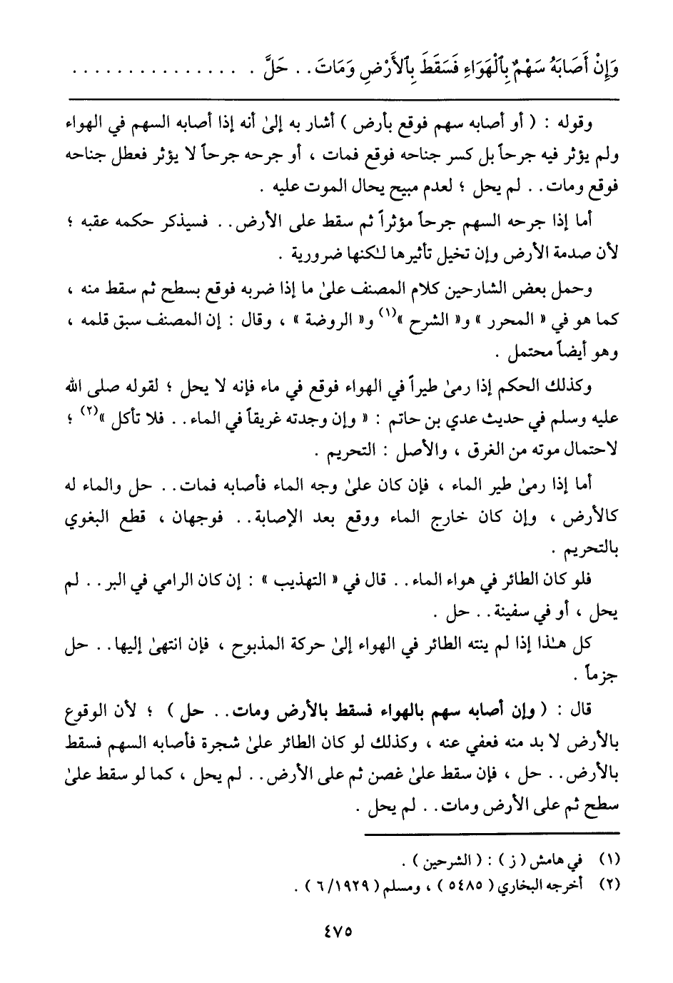 قال: (وإن أصابه سهم بالهواء فسقط بالأرض ومات .. حل)؛ لأن الوقوع بالأرض لابد منه فعفي عنه، وكذلك لو كان الطائر على شجرة فأصابه السهم فسقط بالأرض .. حل، فإن سقط على غصن ثم على الأرض .. لم يحل، كما لو سقط على سطح ثم على الأرض ومات .. لم يحل.