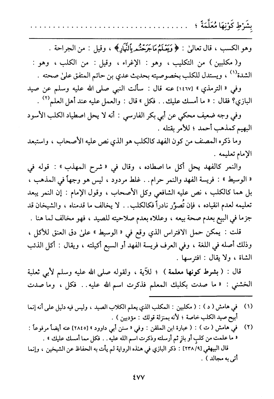 وما ذكره المصنف من كون الفهد كالكلب هو الذي نص عليه الأصحاب، واستبعد الإمام تعليمه.