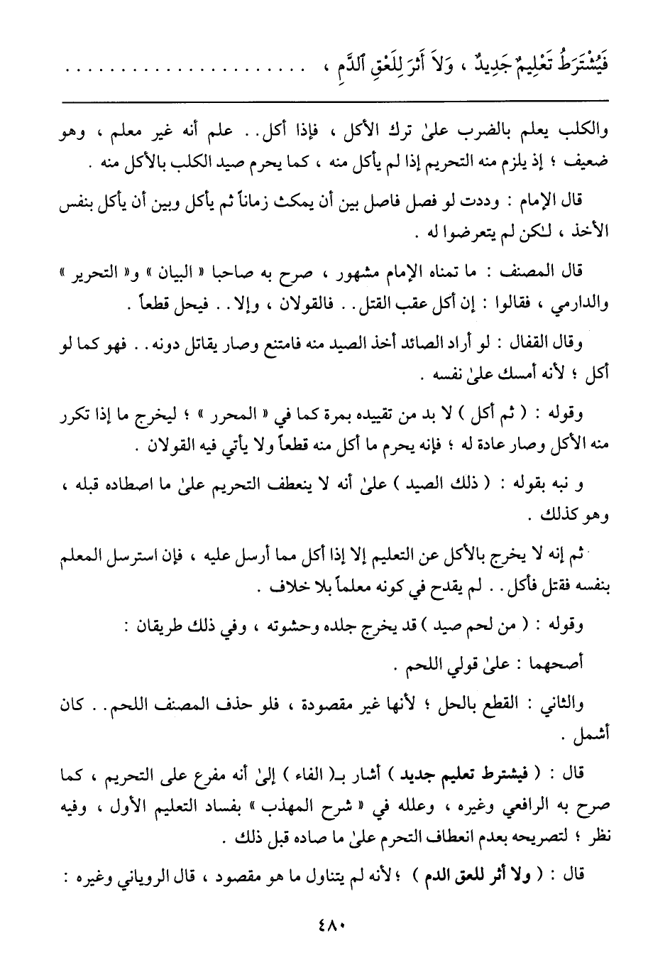 قال: (فيشترط تعليم جديد) أشار بـ (الفاء) إلى مفرع على التحريم، كما صرح به الرافعي وغيره، وعلله في (شرح المهذب) بفساد التعليم الأول، وفيه نظر؛ لتصريحه بعدم انعطاف التحرم على ما صاده قبل ذلك.