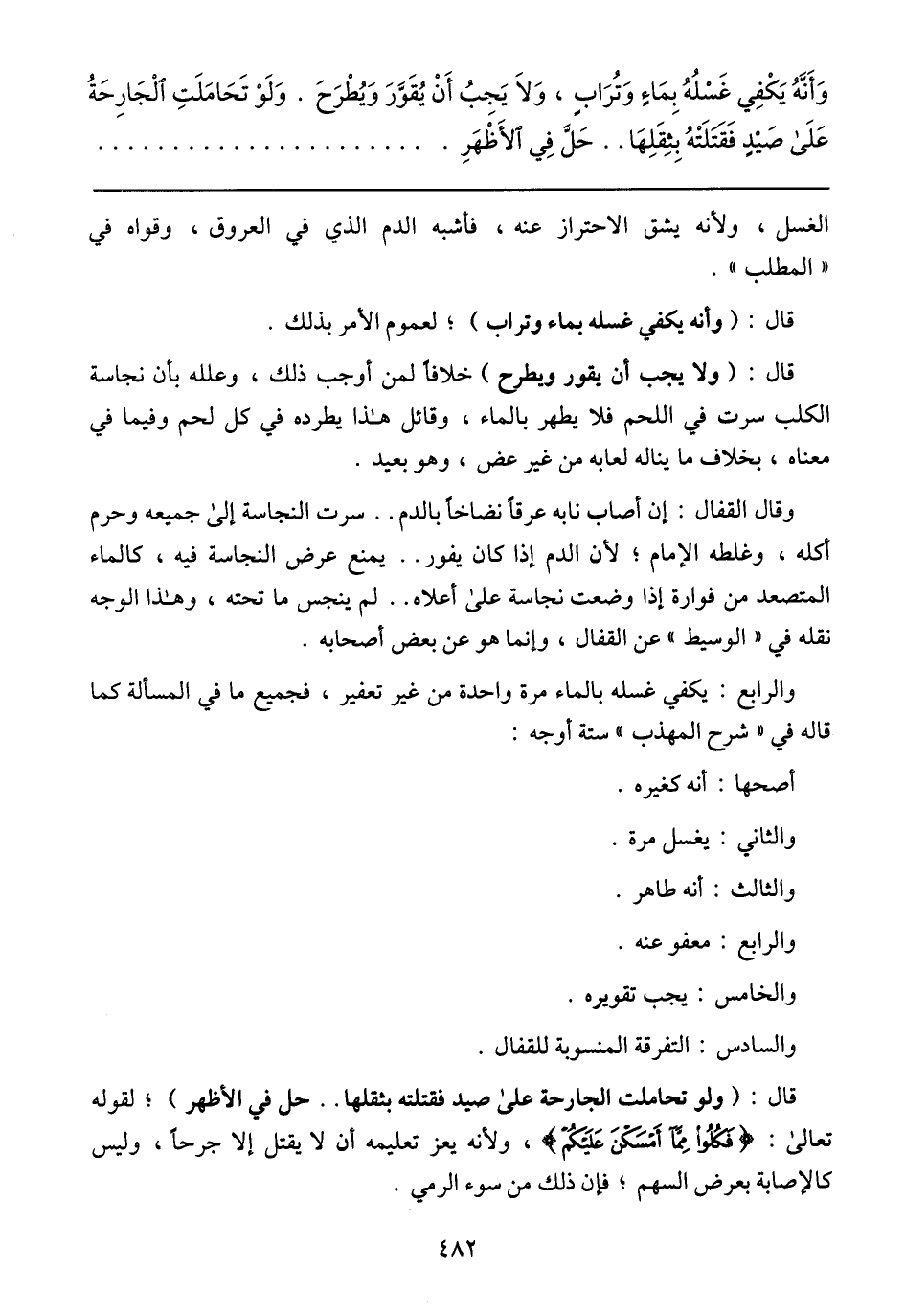 وقال القفال: إن أصاب نابه عرقًا نضاخًا بالدم .. سرت النجاسة إلى جميعه وحرم أكله، وغلطه الإمام؛ لأن الدم إذا كان يفور .. يمنع عرض النجاسة فيه، كالماء المتصعد من فوارة إذا وضعت نجاسة على أعلاه .. لم ينجس ما تحته، وهذا الوجه نقله في (الوسيط) عن القفال، وإنما هو عن بعض أصحابه.