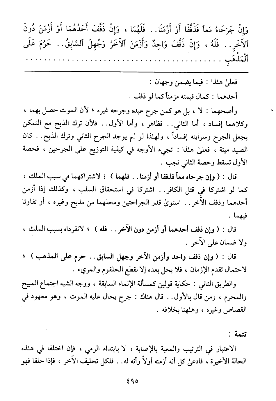 وَإِنْ جَرَحَاهُ مَعًا فَذَفَّفَا أَوْ أَزْمَنَا .. فَلَهُمَا، وَإِنْ ذَفَّفَ أَحَدُهُمَا أَوْ أَزْمَنَ دُونَ الآخَرِ .. فَلَهُ، وَإِنْ ذَفَّفَ وَاحِدٌ وَأَزْمَنَ الآخَرُ وَجُهِلَ السَّابِقُ .. حَرُمَ عَلَى الْمَذْهَبِ