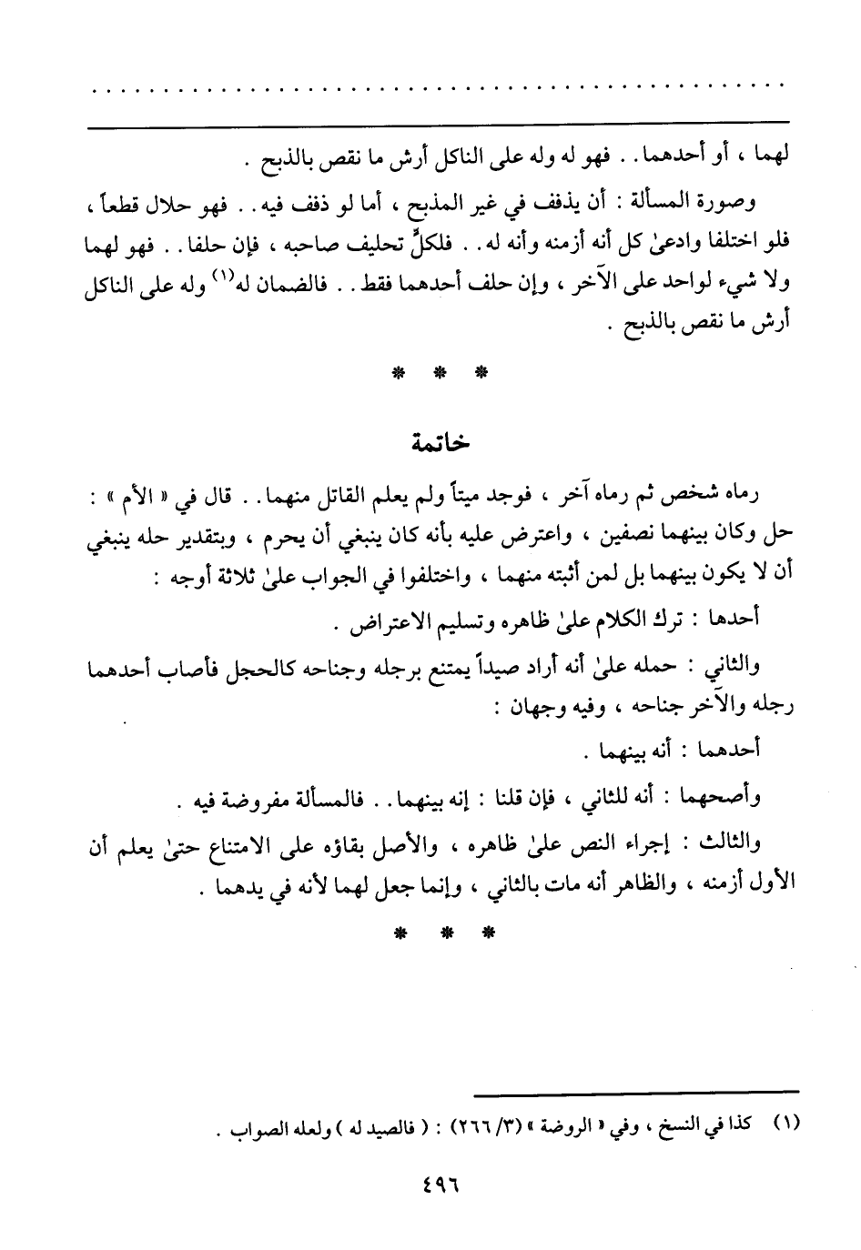 وصورة المسالة: أن يذفف في غير المذبح، أما لو ذفف فيه .. فهو حلال قطعًا، فلو اختلفا وادعى كل أنه أزمنه وأنه له .. فلكلٍّ تحليف صاحبه، فإن حلفا .. فهو لهما ولا شيء لواحد على الآخر، وإن حلف أحدهما فقط .. فالضمان له وله على الناكل أرش ما نقص بالذبح.