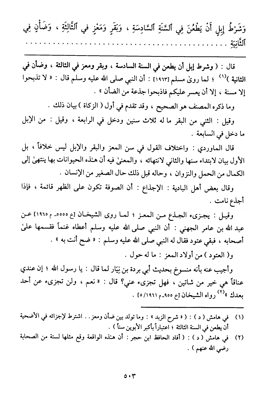 قال الماوردي: واختلاف القول فين سن المعز والبقر والإبل ليس خلافًا، بل الأول بيان لابتداء سنها والثاني لانتهائه، والمعنى فيه أن هذه الحيوانات بها ينتهى إلى الكمال من الحمل والنزوان، وحاله قبل ذلك حال الصغير من الإنسان.