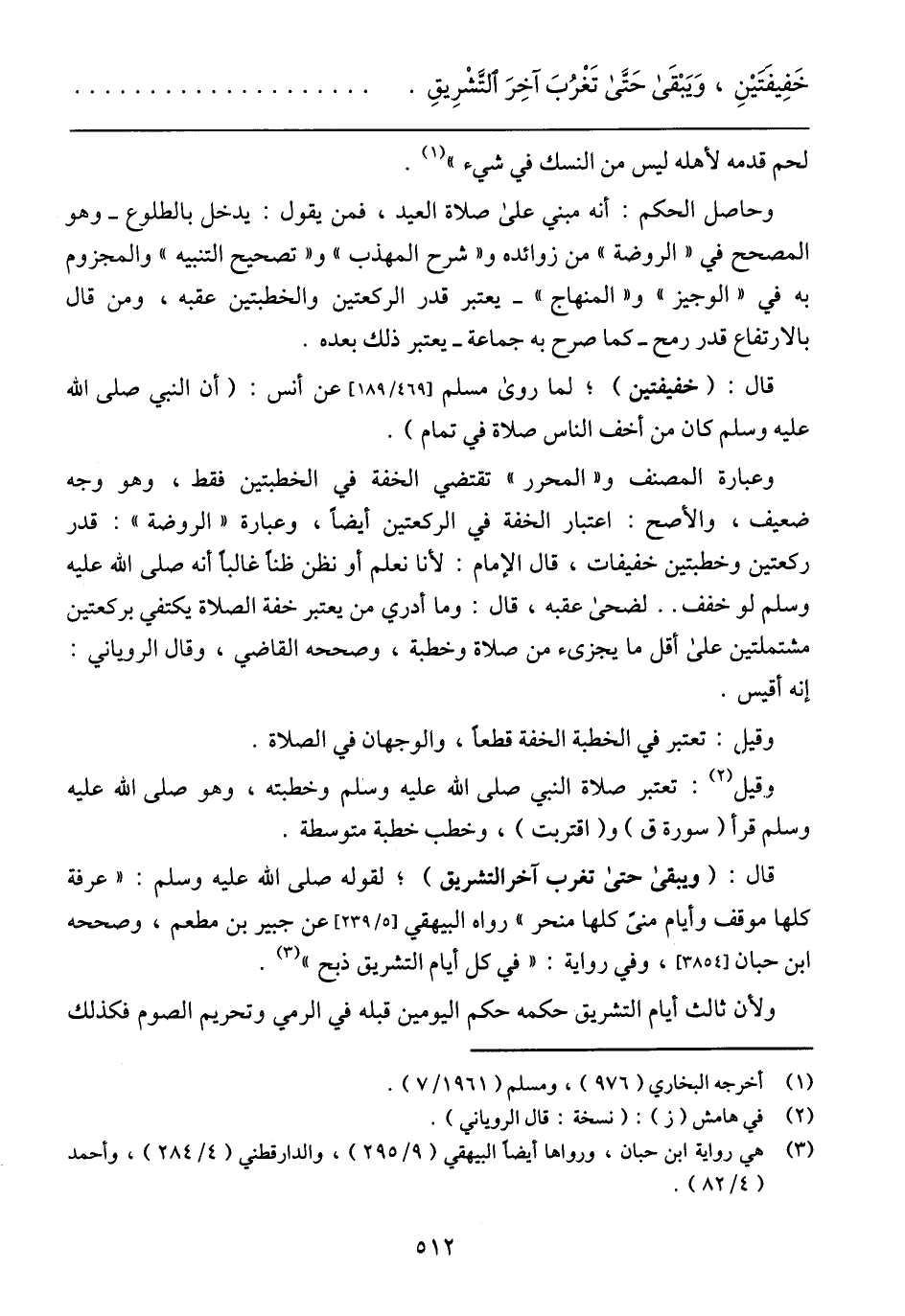 وعبارة المصنف و (المحرر) تقتضي الخفة في الخطبتين فقط، وهو وجه ضعيف، والأصح: اعتبار الخفة في الركعتين أيضًا، وعبارة (الروضة) قدر ركعتين وخطبتين خفيفات، قال الإمام: لأنا نعلم أو نظن ظنًا غالبًا أنه صلى الله عليه وسلم لو خفف .. لضحى عقبه، قال: وما أدري من يعتبر خفة الصلاة يكتفي بركعتين مشتملتين على أقل ما يجزئ من صلاة وخطبة، وصححه القاضي، وقال الروياني: إنه أقيس.