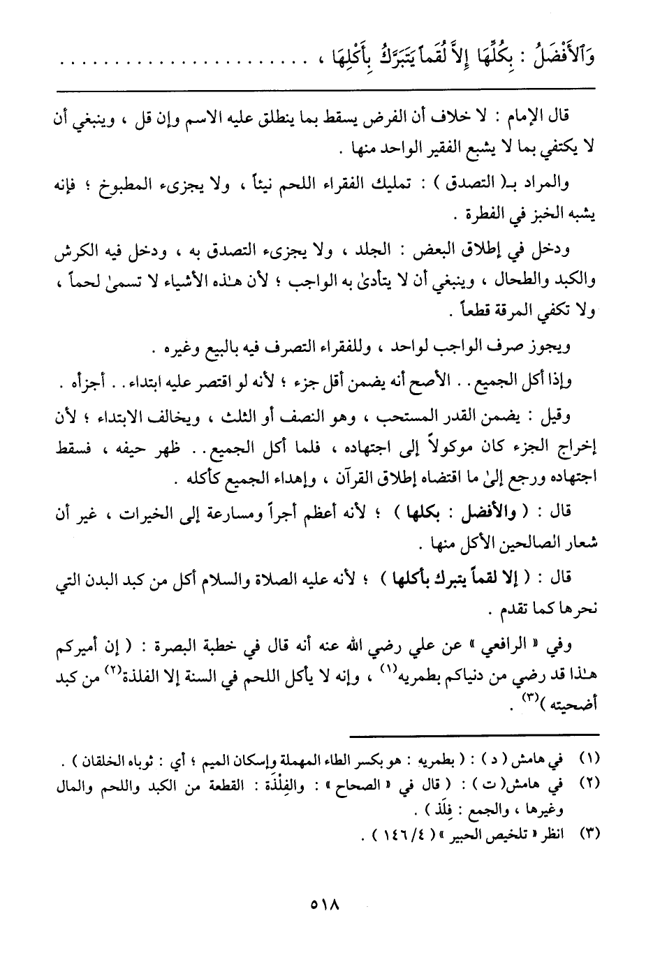 ودخل في إطلاق البعض: الجلد، ولا يجزئ التصدق به، ودخل فيه الكرش والكبد والطحال، وينبغي أن لا يتأدى به الواجب؛ لأن هذه الأشياء لا تسمى لحمًا، ولا تكفي المرقة قطعًا.