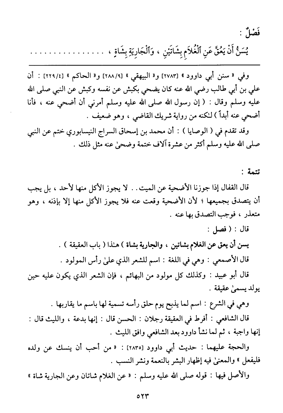 قال الشافعي: أفرط في العقيقة رجلان: الحسن قال: إنها بدعة، والليث قال: إنها واجبة، ثم لما نشأ داوود بعد الشافعي وافق الليث.