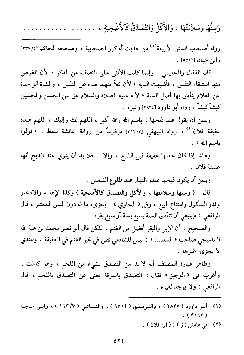 قال القفال والحليمي: وإنما كانت الأنثى على النصف من الذكر؛ لأن الغرض منها استبقاء النفس، فأشبهت الدية؛ لأن كلاً منهما فداء عن النفس، والشاة الواحدة عن الغلام يتأدى بها أصل السنة؛ لأنه عليه الصلاة والسلام عق عن الحسن والحسين كبشًا كبشًا، رواه أبو داوود [2834] وغيره.