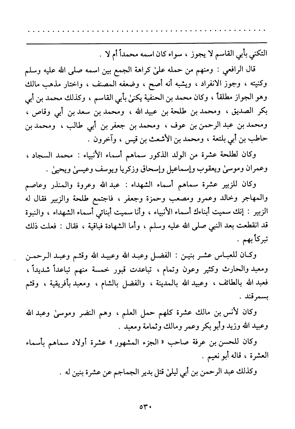 قال الرافعي: ومنهم من حمله على كراهة الجمع بين اسمه صلى الله عليه وسلم وكنيته، وجوز الانفراد، ويشبه أنه أصح، وضعفه المصنف، واختار مذهب مالك وهو الجواز مطلقًا، وكان محمد بن الحنفية يكنى بأبي القاسم، وكذلك محمد بن أبي بكر الصديق، ومحمد بن طلحة بن عبيد الله، ومحمد بن سعد بن أبي وقاص، ومحمد بن عبد الرحمن بن عوف، ومحمد بن جعفر بن أبي طالب، ومحمد بن حاطب بن أبي بلتعة، ومحمد بن الأشعت بن قيس، وآخرون.