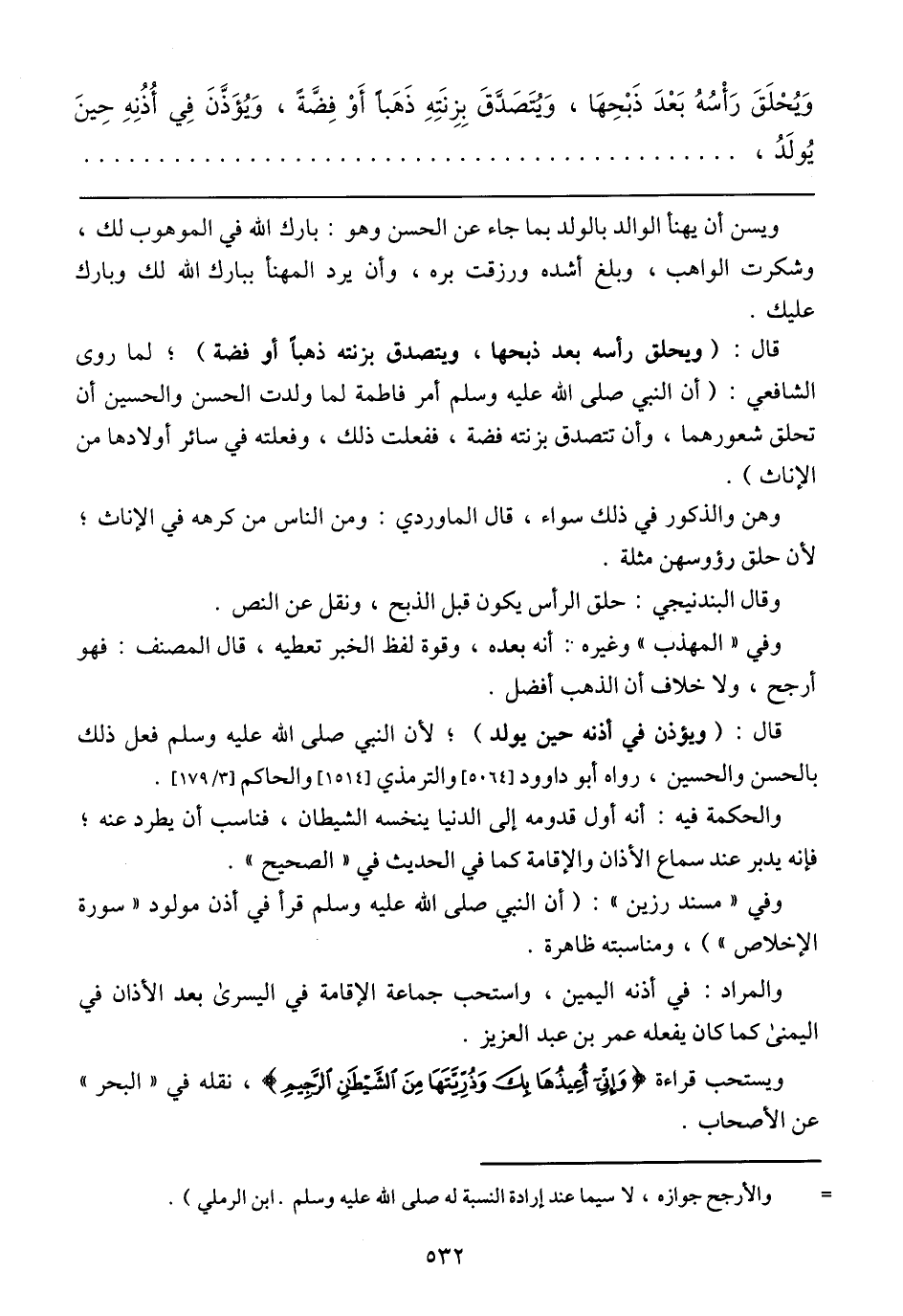 وَيُحْلَقَ رَاسُهُ بَعْدَ ذَبْحِهَا، وَيُتَصَدَّقَ بِزِنَتِهِ ذَهَبًا أَوْ فِضَّةً، وَيُؤَذَّنَ فِي أُذُنِهِ حِينَ يُولَدُ،