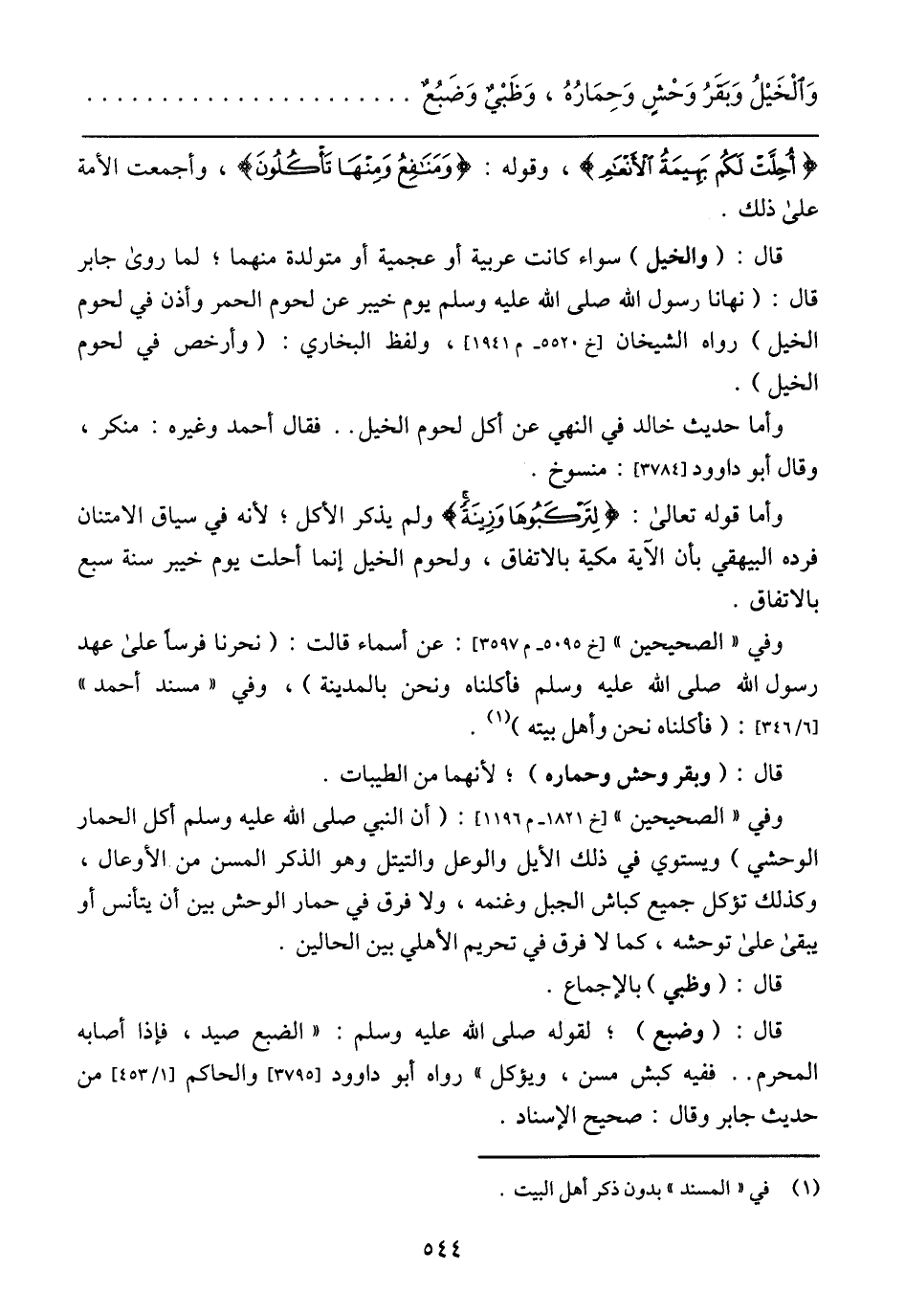 قال: (والخيل) سواء كانت عربية أو عجمية أو متولدة منهما؛ لما روى جابر قال: (نهانا رسول الله صلى الله عليه وسلم يوم خيبر عن لحوم الحمر وأذن في لحوم الخيل) رواه الشيخان [خ 5520 - م 1941]، ولفظ البخاري: (وأرخص في لحوم الخيل).