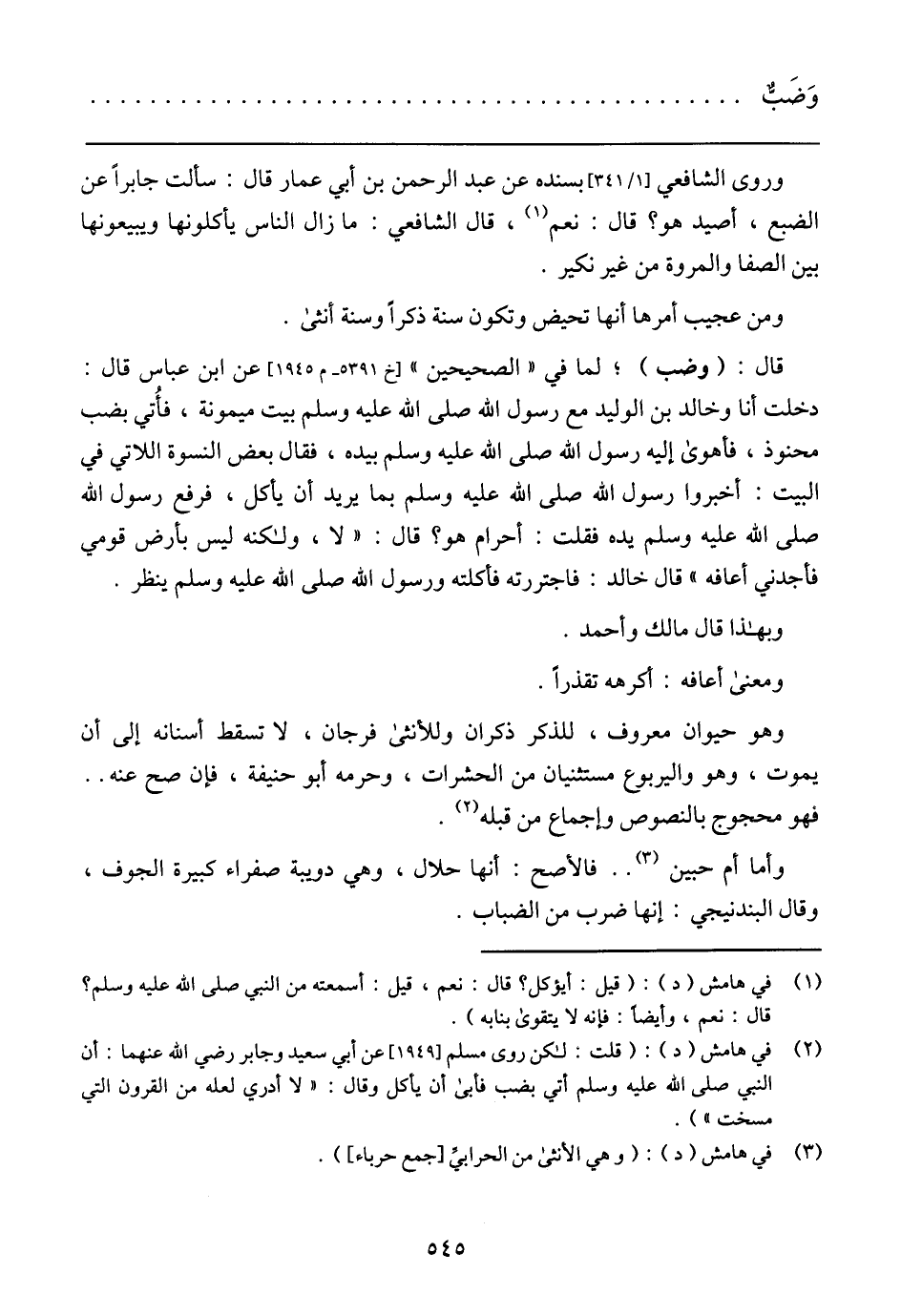 قال: (وضب)؛ لما في (الصحيحين) [خ 5391 - م 1945] عن ابن عباس قال: دخلت أنا وخالد بن الوليد مع رسول الله صلى الله عليه وسلم بيت ميمونة، فأُتي بضب محنوذ، فأهوى إليه رسول الله صلى الله عليه وسلم بيده، فقال بعض النسوة اللاتي في البيت: أخبروا رسول الله صلى الله عليه وسلم بما يريد أن يأكل، فرفع رسول الله صلى الله عليه وسلم يده فقلت: أحرام هو؟ قال: (لا، ولكنه ليس بأرض قومي فأجدني أعافه) قال خالد: فاجتررته فأكلته ورسول الله صلى الله عليه وسلم ينظر.