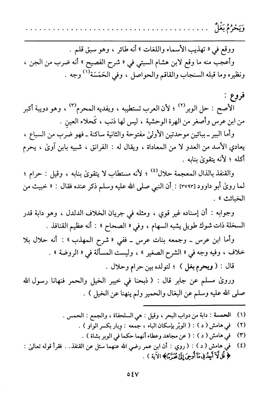 وأما ابن عرس –وجمعه بنات عرس- ففي (شرح المهذب): أنه حلال بلا خلاف، وفيه وجه في (الشرح الصغير)، وليست المسألة في (الروضة).