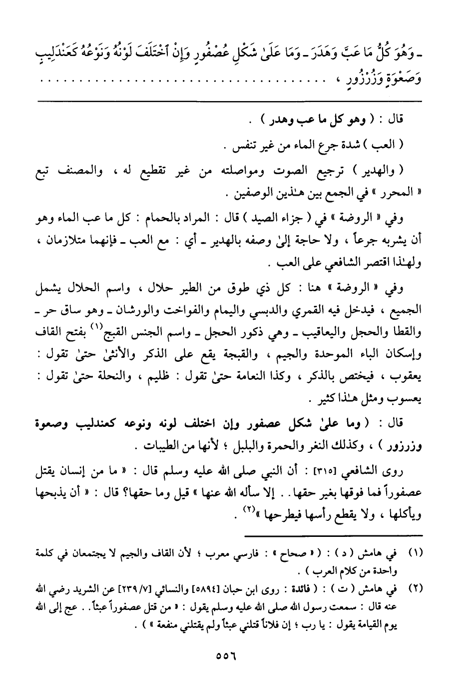 - وَهُوَ كُلُّ مَا عَبَّ وَهَدَرَ- وَمَا عَلَى شَكْلِ عُصْفُورٍ وَإِنْ اخْتَلَفَ لَوْنُهُ وَنَوْعُهُ كَعَنْدَلِيبٍ وَصَعْوَةٍ وَزُرْزُورٍ،
