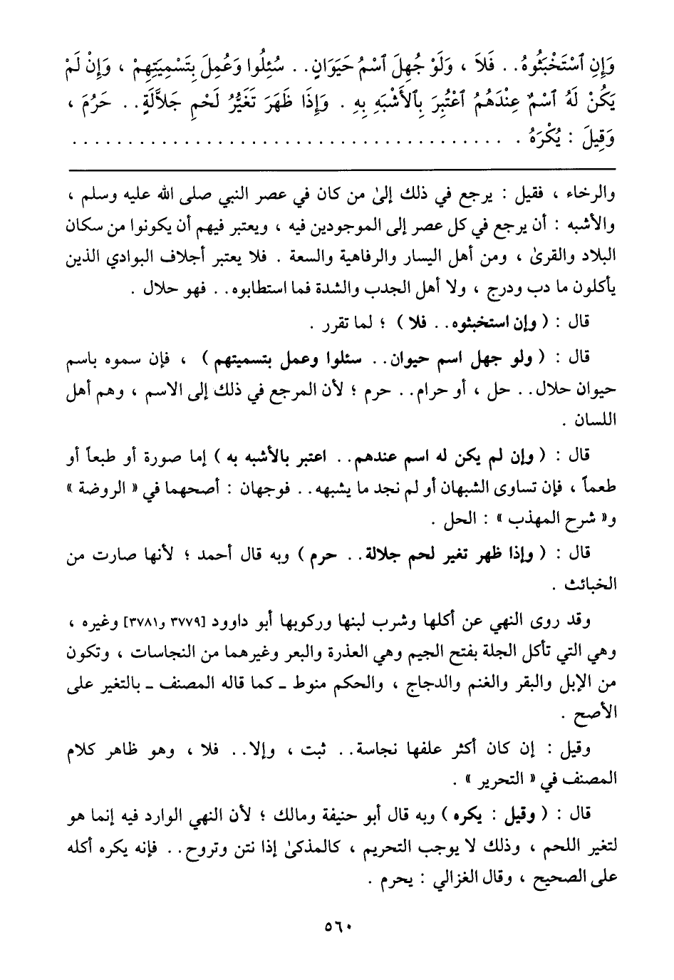 وَإِنْ اسْتَخْبَثُوهُ .. فَلاَ، وَلَوْ جُهِلَ اسْمُ حَيَوَانٍ .. سُئِلُوا وَعُمِلَ بِتَسْمِيَتِهِمْ، وَإِنْ لَمْ يَكُنْ لَهُ اسْمٌ عِنْدَهُمُ اعْتُبِرَ بِالأَشْبَهِ بِهِ. وَإِذَا ظَهَرَ تَغَيُّرُ لَحْمِ جَلاَّلَةٍ .. حَرُمَ، وَقِيلَ: يُكْرَهُ