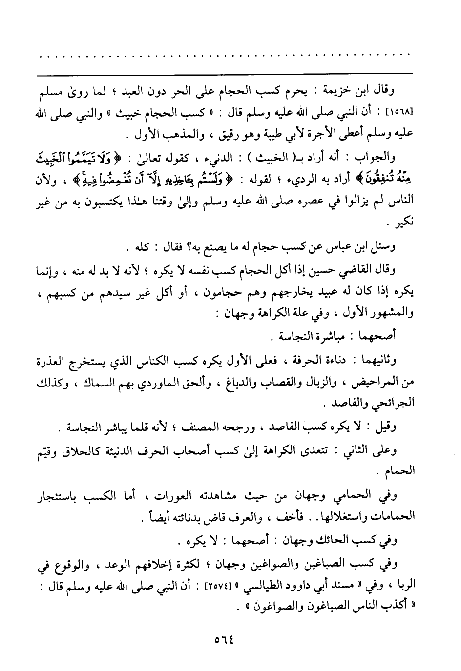 وقال ابن خزيمة: يحرم كسب الحجام على الحر دون العبد؛ لما روى مسلم [1568]: أن النبي صلى الله عليه وسلم قال: (كسب الحجام خبيث) والنبي صلى الله عليه وسلم أعطى الأجرة لأبي طيبة وهو رقيق، والمذهب الأول.