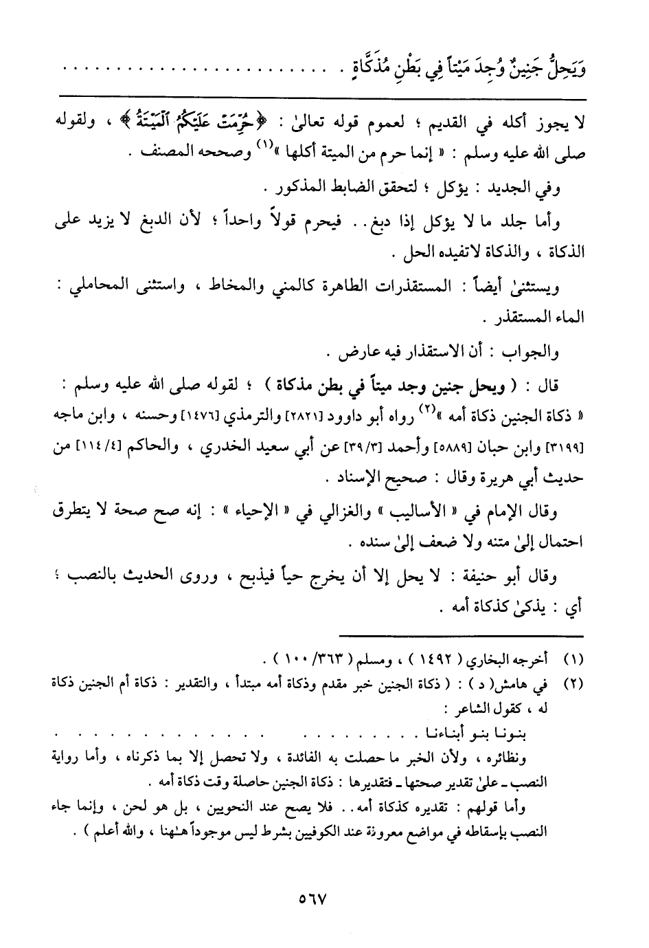قال: (ويحل جنين وجد ميتًا في بطن مذكاة)؛ لقوله صلى الله عليه وسلم: (ذكاة الجنين ذكاة أمه) رواه أبو داوود [2821] والترمذي [1476] وحسنه، وابن ماجه [3199] وابن حبان [5889] وأحمد [3/ 93] عن أبي سعيد الخدري، والحاكم [4/ 114] من حديث أبي هريرة وقال: صحيح الإسناد.
