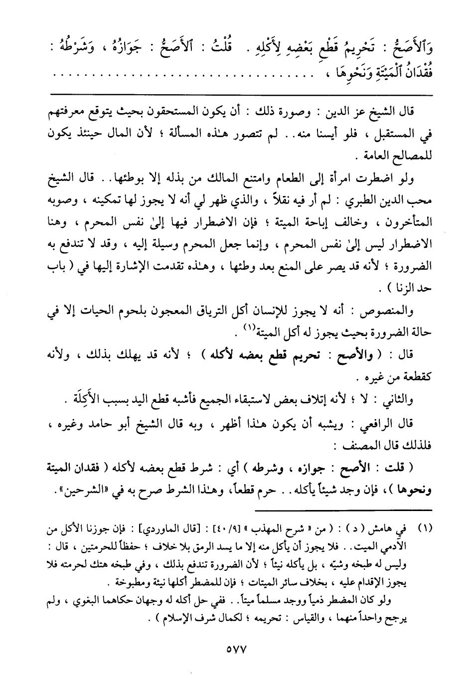 (قلت: الأصح: جوازه، وشرطه) أي: شرط قطع بعضه لأكله (فقدان الميتة ونحوها)، فإن وجد شيئًا يأكله .. حرم قطعًا، وهذا الشرط صرح به في (الشرحين).