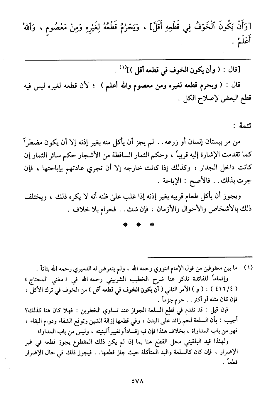 من مر ببستان إنسان أو زرعه .. لم يجز أن يأكل منه بغير إذنه إلا أن يكون مضطرًا كما تقدمت الإشارة إليه قريبًا، وحكم الثمار الساقطة من الأشجار حكم سائر الثمار إن كانت داخل الجدار، وكذلك إذا كانت خارجه إلا أن تجري عادتهم بإباحتها، فإن جرت بذلك .. فالأصح: الإباحة.
