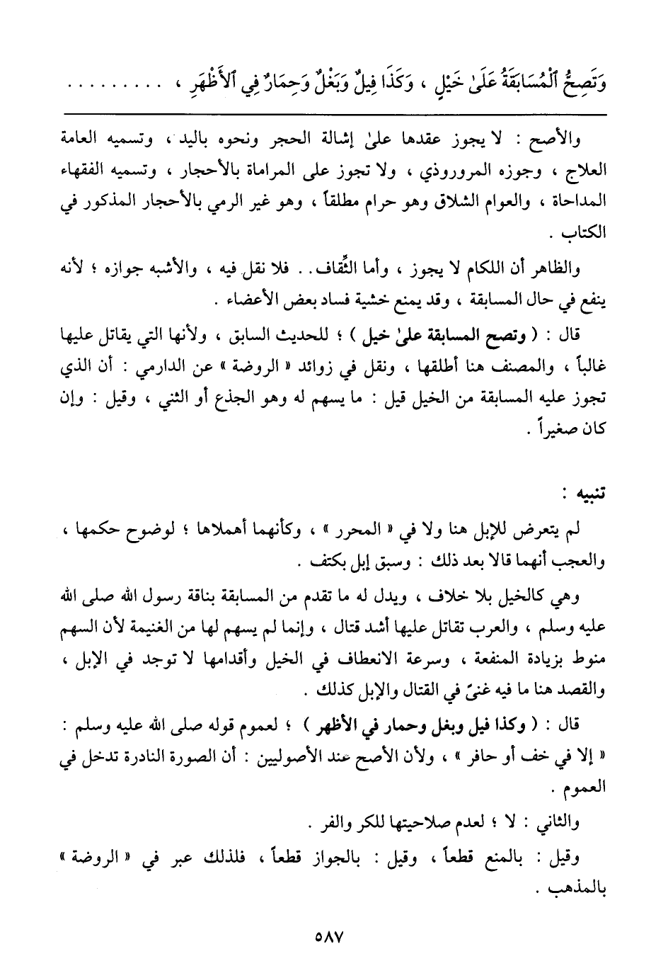 وهي كالخيل بلا خلاف، ويدل له ما تقدم من المسابقة بناقة رسول الله صلى الله عليه وسلم، والعرب تقاتل عليها أشد قتال، وإنما لم يسهم لها من الغنيمة لأن السهم منوط بزيادة المنفعة، وسرعة الانعطاف في الخيل وأقدامها لا توجد في الإبل، والقصد هنا ما فيه غنى في القتال والإبل كذلك.