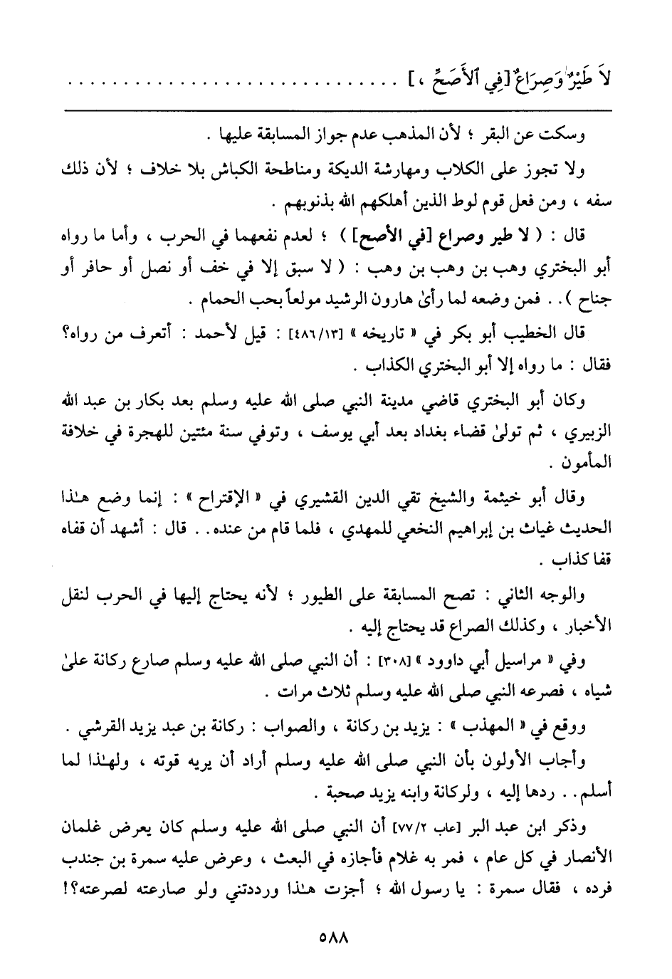 قال: (لا طير وصراع [في الأصح])، لعدم نفعهما في الحرب، وأما ما رواه أبو البختري وهب بن وهب بن وهب: (لاسبق إلا في خف أو نصل أو حافر أو جناح) .. فمن وضعه لما رأي هارون الرشيدي مولعًا بحب الحمام.