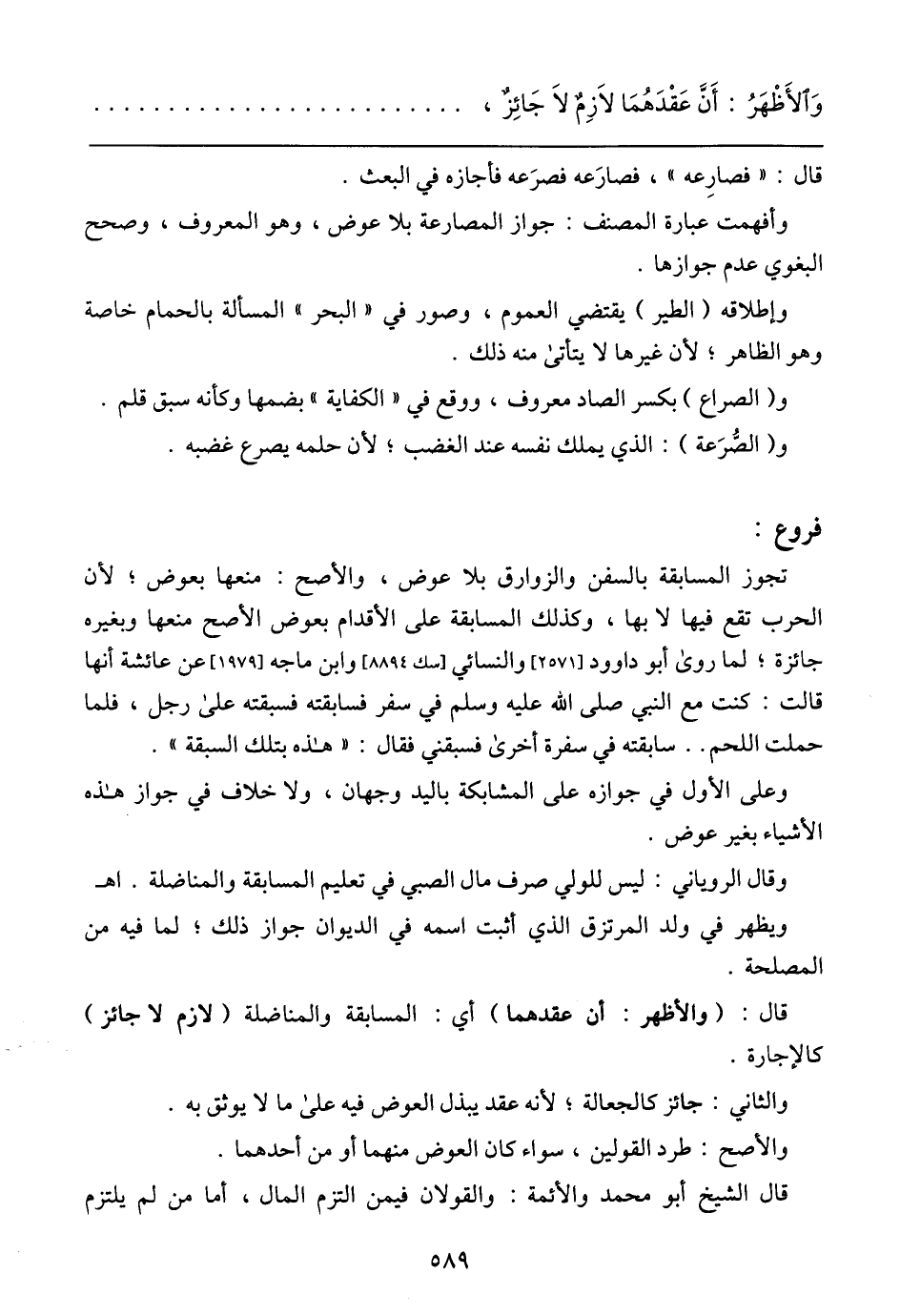 تجوز المسابقة بالسفن والزوارق بلا عوض، والأصح: منعها بعوض؛ لأن الحرب تقع فيها لا بها، وكذلك المسابقة على الأقدام بعوض الأصح منعها وبغيره جائزة، لما روى أبو داوود [2571] والنسائي [سك 8894] وابن ماجه [1979] عن عائشة أنها قالت: كنت مع النبي صلى الله عليه وسلم في سفر فسابقته فسبقته على رجل، فلما حملت اللحم .. سابقته في سفرة أخرى فسبقني فقال: (هذه بتلك السبقة).