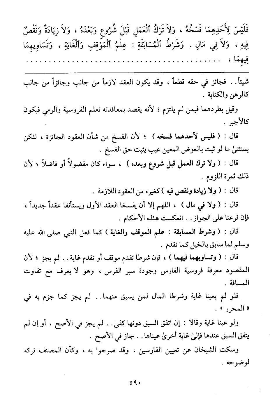 فَلَيْسَ لِأَحَدِهِمَا فَسْخُهُ، وَلاَ تَرْكُ الْعَمَلِ قَبْلَ شُرُوعِ وَبَعْدَهُ، وَلاَ زِيَادَةٌ وَنَقْصٌ فِيهِ، وَلاَ فِي مَالٍ. وَشَرْطُ الْمُسَابَقَةِ: عِلْمُ المَوْقِفِ وَالغَايَةِ، وَتَسَاوِيهمَا فِيهِمَا،