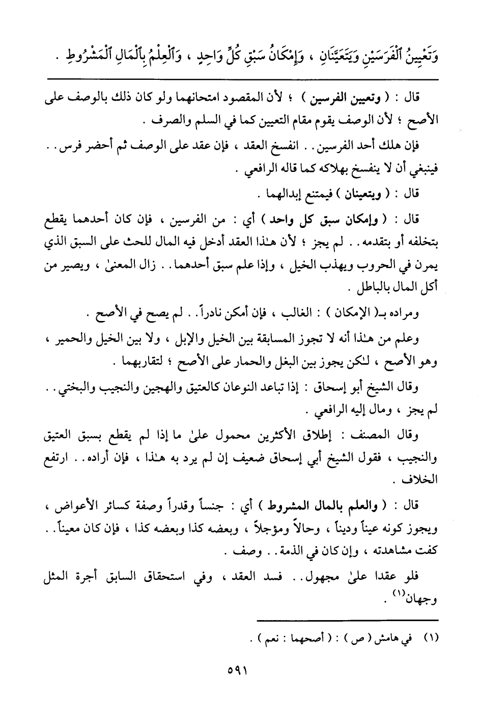 قال: (وتعيين الفرسين)؛ لأن المقصود امتحانهما ولو كان ذلك بالوصف على الأصح، لأن الوصف يقوم مقام التعيين كما في السلم والصرف.