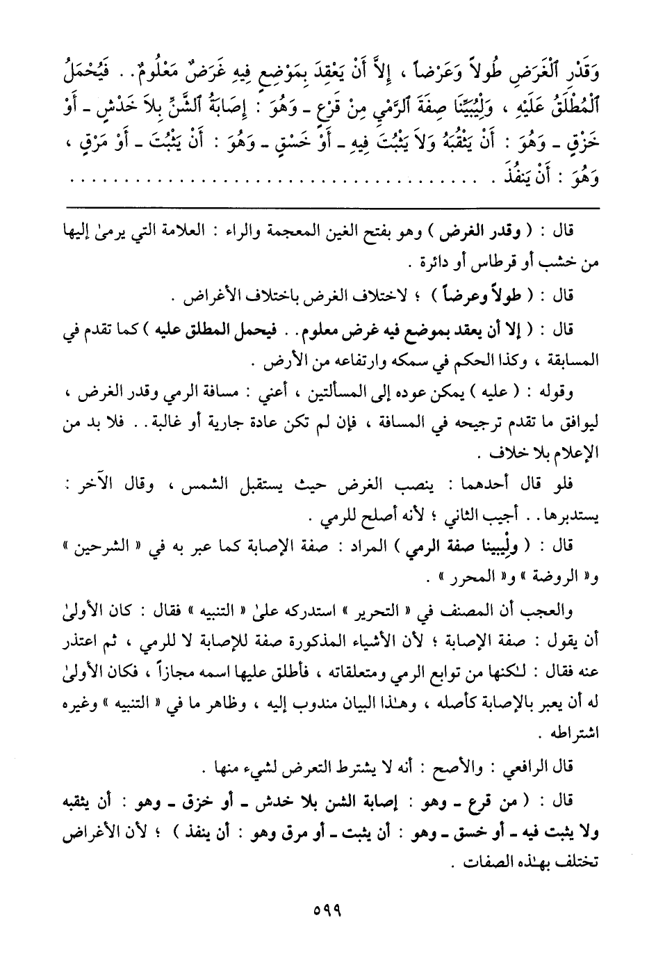 وَقَدْر الْغَرضِ طُولاً وَعَرْضًا إِلاَّ أَنْ يَعْقِدَ بِمَوْضِعٍ فِيهِ غَرضٌ مَعْلُومٌ .. فَيُحْمَلُ الْمُطْلَقُ عَلَيهِ، وَلْيُبَينَا صِفَةَ الرَّمْيِ مِنْ قَرْعٍ- وَهُوَ: إِصَابَةُ الشَّنُ بِلاَ خَدْشٍ- أَوْ خَزْقٍ- وَهُوَ: أَنْ يَثقُبَهُ وَلاَ يَثْبُتَ فِيهِ- أَوْ خَسْقٍ- وَهُوَ: أَنْ يَثْبُتَ- أَوْ مَزْقٍ، وَهَوَ: أَنْ ينْفُذَ