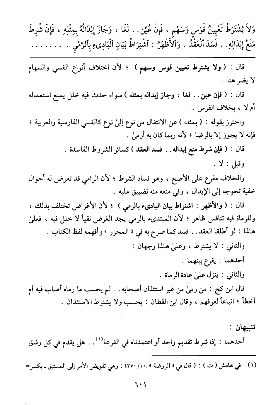 وَلاَ يُشْتَرَطُ تَعْيِينُ قَوْسِ وَسَهْمٍ، فَإِنْ عُيِّن .. لَغَا، وَجَازَ إِبْدَالُهُ بِمِثْلِهِ، فَإِنْ شُرِطَ مَنْعُ إِبْدَالِهِ .. فَسَدَ الْعَقْدُ .. وَالأَظْهَرُ: اشْتِرَاطُ بَيَانِ الْبَادِئِ بِالَّرمْيِ