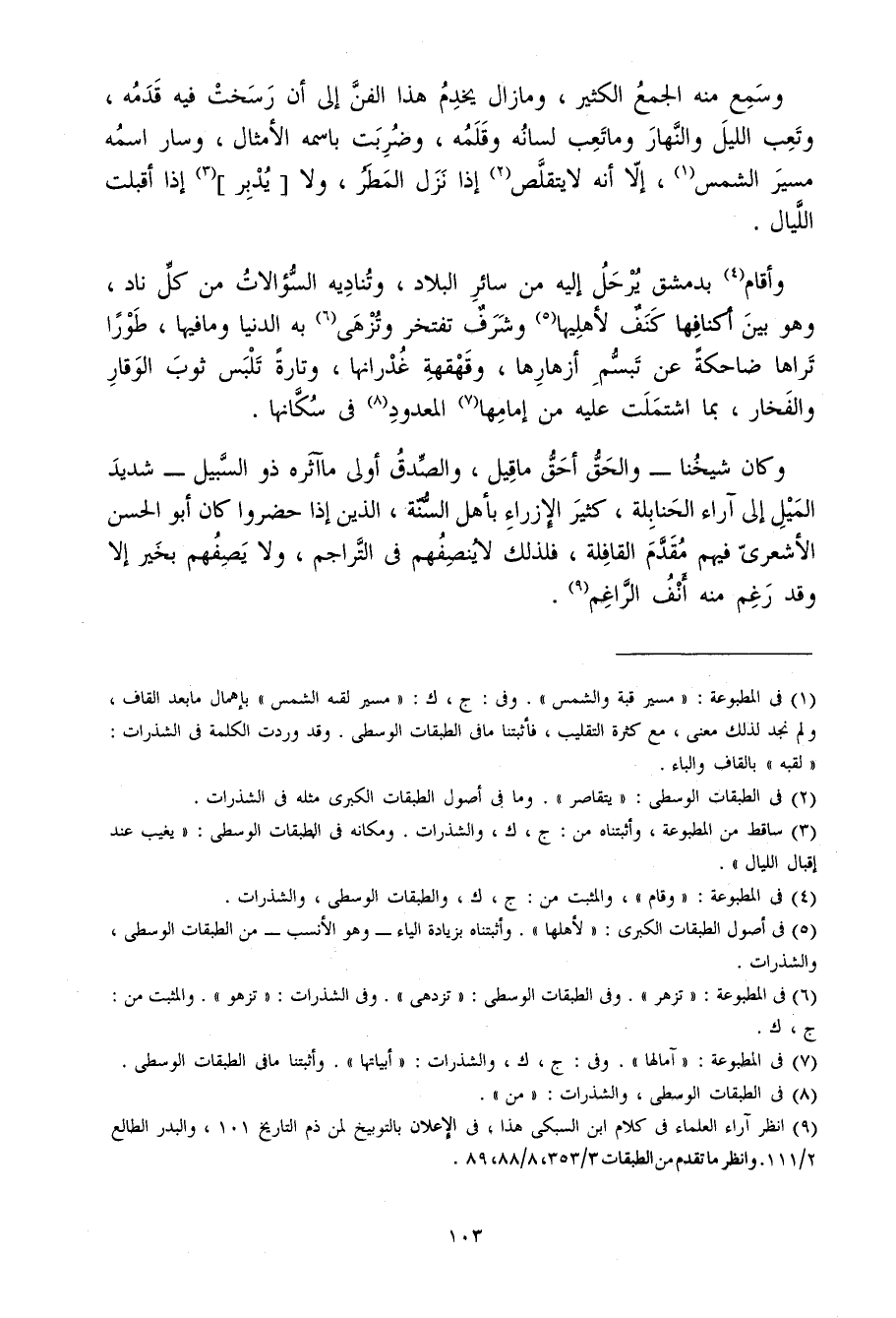 وَكَانَ شَيخنَا وَالْحق أَحَق مَا قيل والصدق أولى مَا آثره ذُو السَّبِيل شَدِيد الْميل إِلَى آراء الْحَنَابِلَة كثير الإزراء بِأَهْل السّنة الَّذين إِذا حظروا كَانَ أَبُو الْحسن الْأَشْعَرِيّ فيهم مقدم الْقَافِلَة فَلذَلِك لَا ينصفهم فِي التراجم وَلَا يصفهم بِخَير إِلَّا وَقد رغم مِنْهُ أنف الراغم