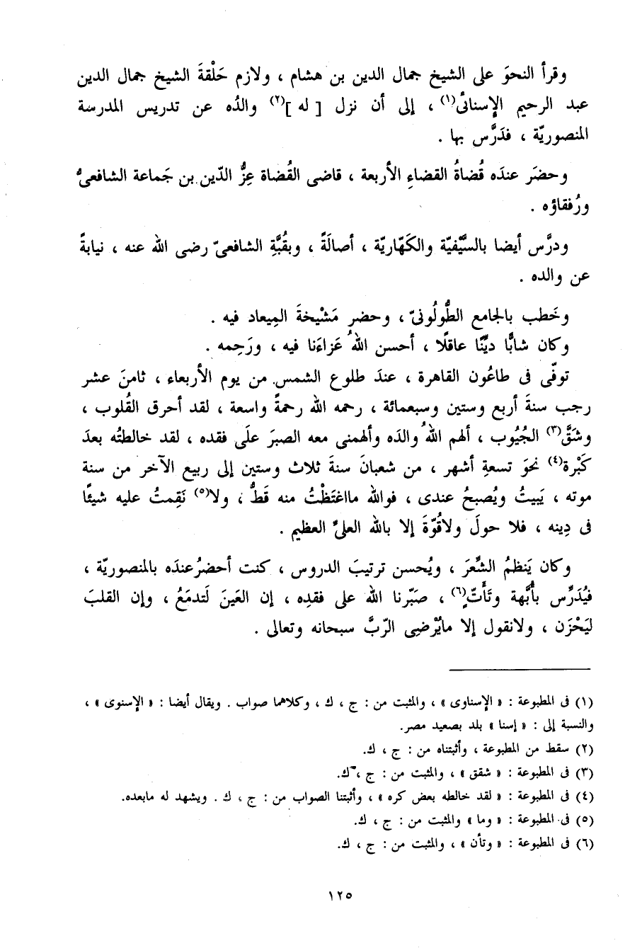 وَقَرَأَ النَّحْو على الشَّيْخ جمال الدّين بن هِشَام ولازم حَلقَة الشَّيْخ جمال عبد الرَّحِيم الإسنائي إِلَى أَن نزل لَهُ وَالِده عَن تدريس الْمدرسَة المنصورية فدرس بهَا