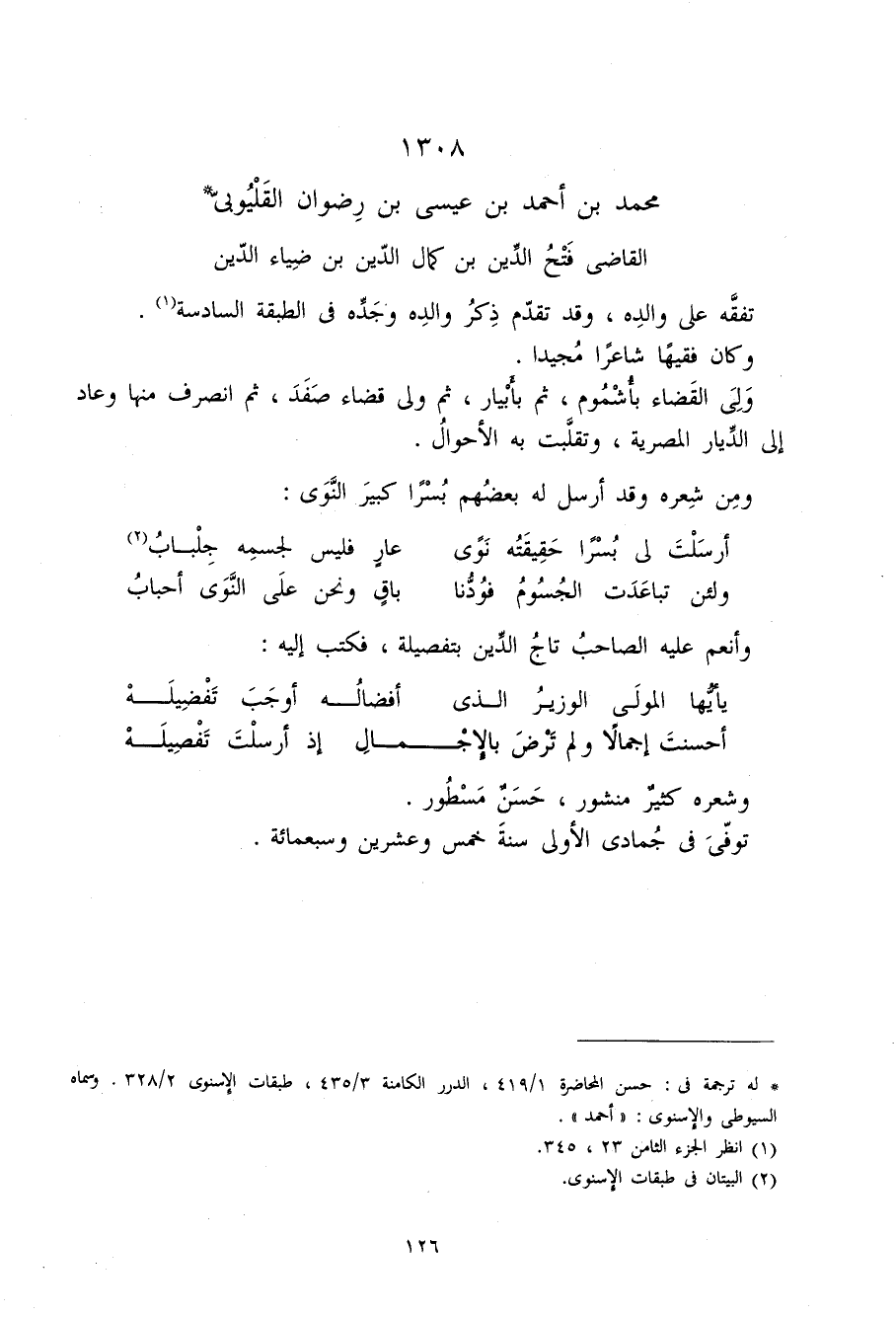 1308 - مُحَمَّد بن أَحْمد بن عِيسَى بن رضوَان القليوبي القَاضِي فتح الدّين بن كَمَال الدّين بن ضِيَاء الدّين