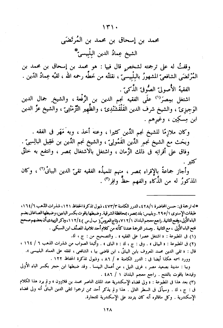 1310 - مُحَمَّد بن إِسْحَاق بن مُحَمَّد بن المرتضى الشَّيْخ عماد الدّين البلبيسي
