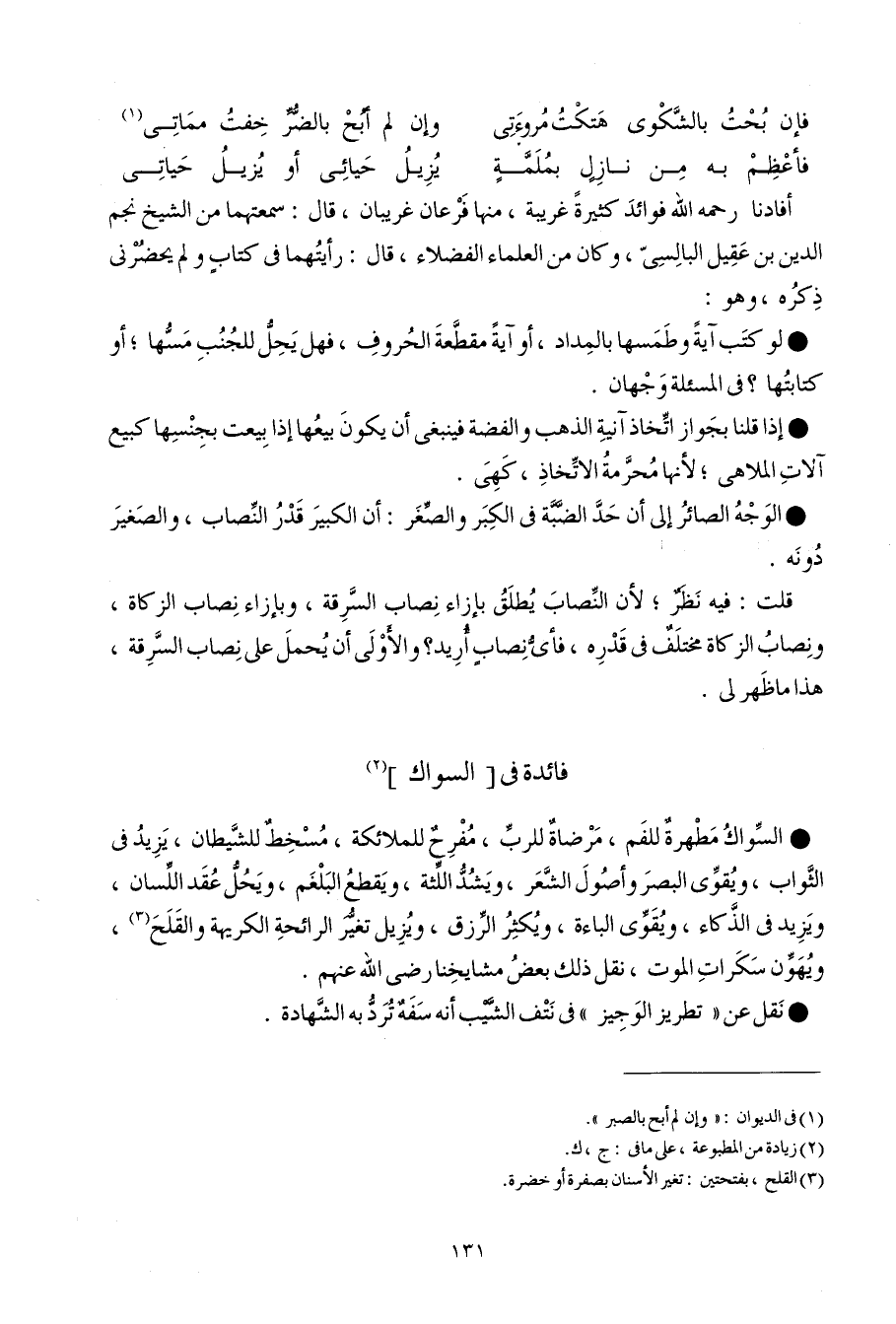 أفادنا رَحمَه الله فَوَائِد كَثِيرَة غَرِيبَة مِنْهَا فرعان غَرِيبَانِ قَالَ سمعتهما من الشَّيْخ نجم الدّين بن عقيل البالسي وَكَانَ من الْعلمَاء الْفُضَلَاء قَالَ رأيتهما فِي كتاب وَلم يحضرني ذكره وَهُوَ