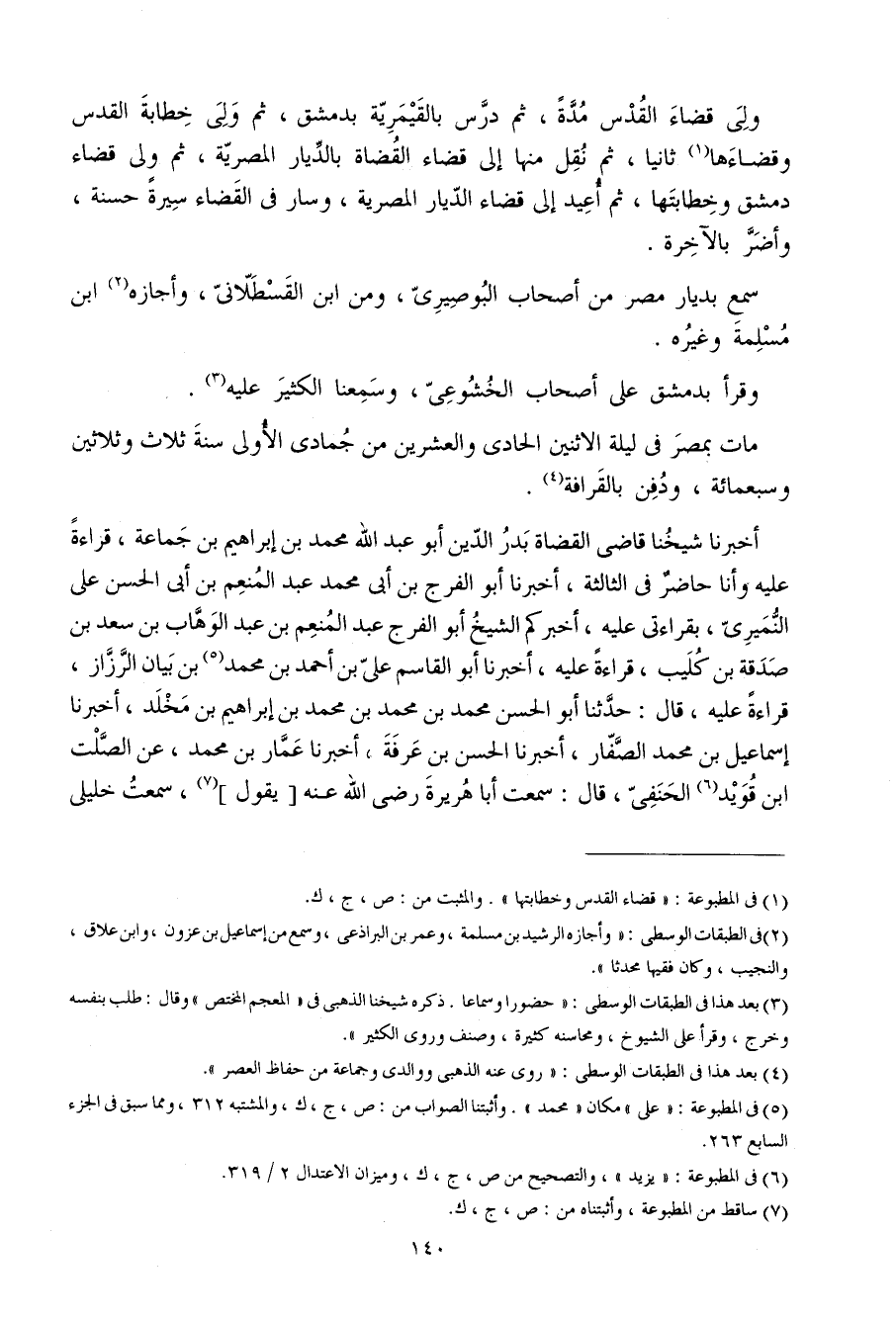 أخبرن شَيخنَا قَاضِي الْقُضَاة بدر الدّين أَبُو عبد الله مُحَمَّد بن إِبْرَاهِيم بن جمَاعَة قِرَاءَة عَلَيْهِ وَأَنا حَاضر فِي الثَّالِثَة أخبرنَا أَبُو الْفرج بن أبي مُحَمَّد عبد الْمُنعم بن أبي الْحسن على النميري بِقِرَاءَتِي عَلَيْهِ أخْبركُم الشَّيْخ أَبُو الْفرج عبد الْمُنعم بن عبد الْوَهَّاب بن سعد بن صَدَقَة بن كُلَيْب قِرَاءَة عَلَيْهِ أخبرنَا أَبُو الْقَاسِم عَليّ بن أَحْمد بن مُحَمَّد بن بَيَان الرزاز قِرَاءَة عَلَيْهِ قَالَ حَدثنَا أَبُو الْحسن مُحَمَّد بن مُحَمَّد بن إِبْرَاهِيم بن مخلد أخبرنَا إِسْمَاعِيل بن مُحَمَّد الصفار أخبرنَا الْحسن بن عَرَفَة أخبرنَا عمار بن مُحَمَّد عَن الصَّلْت ابْن قويد الْحَنَفِيّ قَالَ سَمِعت أَبَا هُرَيْرَة رَضِي الله عَنهُ يَقُول سَمِعت خليلي