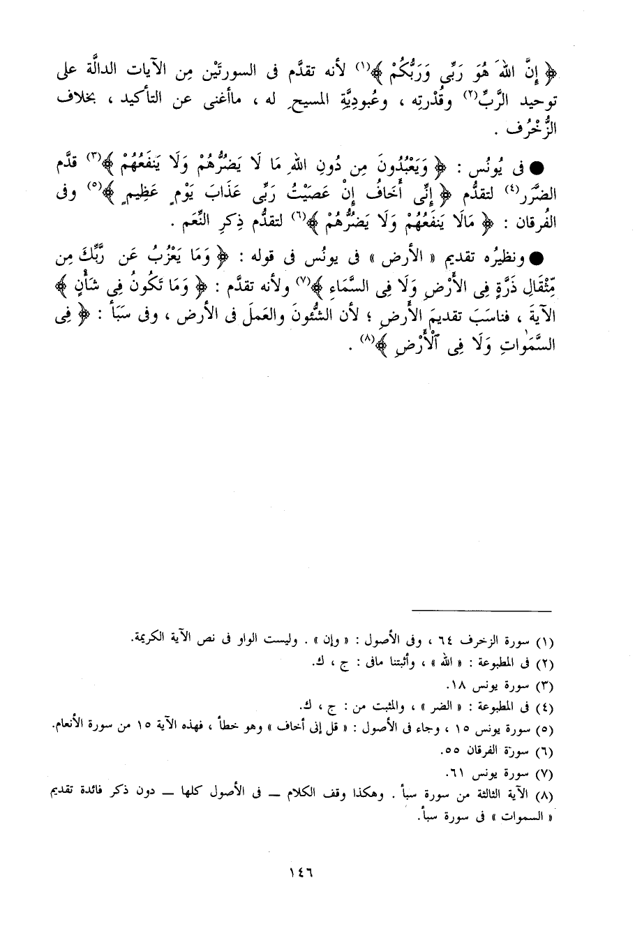 فِي يُونُس {ويعبدون من دون الله مَا لَا يضرهم وَلَا يَنْفَعهُمْ} قدم الضَّرَر لتقدم {إِنِّي أَخَاف إِن عصيت رَبِّي عَذَاب يَوْم عَظِيم} وَفِي الْفرْقَان {مَا لَا يَنْفَعهُمْ وَلَا يضرهم} لتقدم ذكر النعم