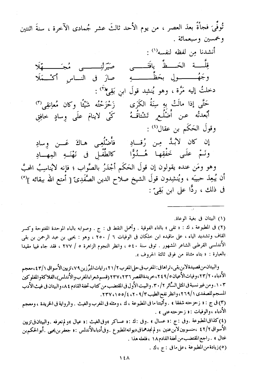 وَهُوَ وَمن عِنْده يَقُولُونَ إِن قَول الحكم أَجْدَر بِالصَّوَابِ فَإِنَّهُ لَا يُنَاسب الْمُحب أَن يبعد حَبِيبه وينشدون قَول الشَّيْخ صَلَاح الدّين الصَّفَدِي أمتع الله بِبَقَائِهِ فِي ذَلِك ردا على ابْن بَقِي