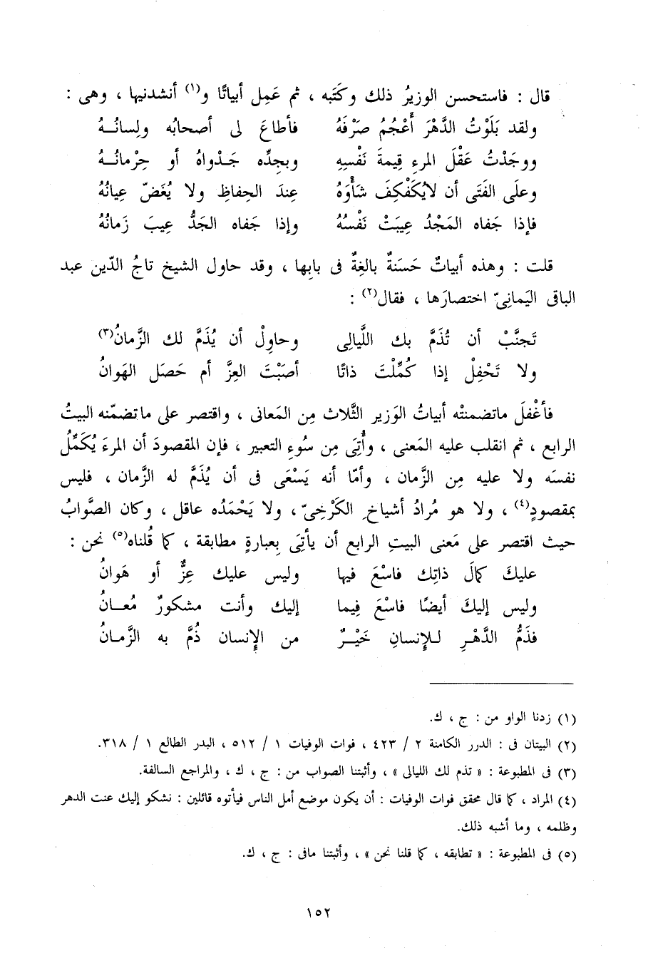 فأغفل مَا تضمنته أَبْيَات الْوَزير الثَّلَاث من الْمعَانِي وَاقْتصر على مَا تضمنه الْبَيْت الرَّابِع ثمَّ انْقَلب عَلَيْهِ الْمَعْنى وَأتي من سوء التَّعْبِير فَإِن الْمَقْصُود أَن الْمَرْء يكمل نَفسه وَلَا عَلَيْهِ من الزَّمَان وَأما أَنه يسْعَى فِي أَن يذم لَهُ الزَّمَان فَلَيْسَ بمقصود وَلَا هُوَ مُرَاد أَشْيَاخ الْكَرْخِي وَلَا يحمده عَاقل وَكَانَ الصَّوَاب حَيْثُ اقْتصر على معنى الْبَيْت الرَّابِع أَن يَأْتِي بِعِبَارَة مُطَابقَة كَمَا قُلْنَاهُ نَحن