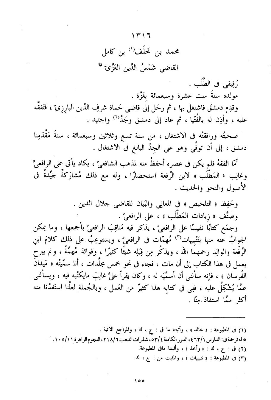 1316 - مُحَمَّد بن خلف بن كَامِل القَاضِي شمس الدّين الْغَزِّي